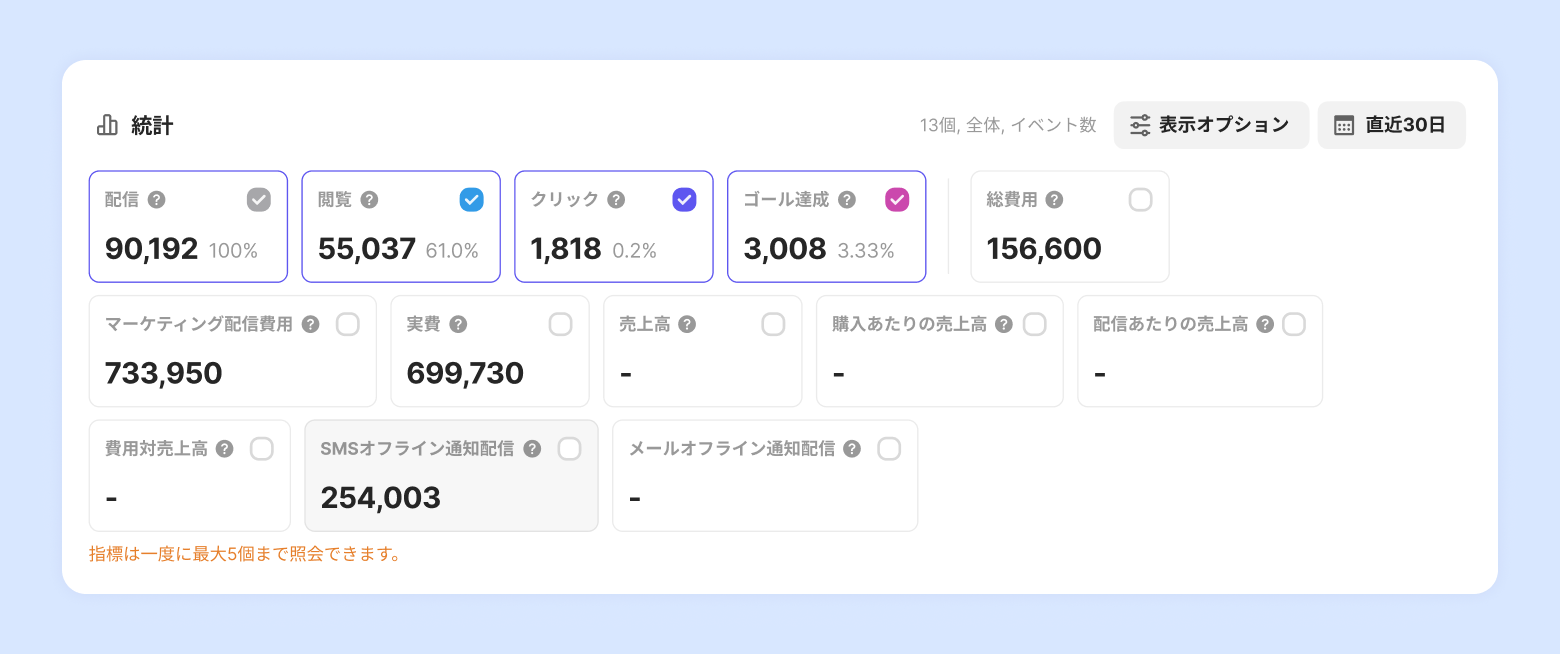 顧客数:マーケティングの配信、閲覧、クリック、ゴール達成された固有の顧客数を指す