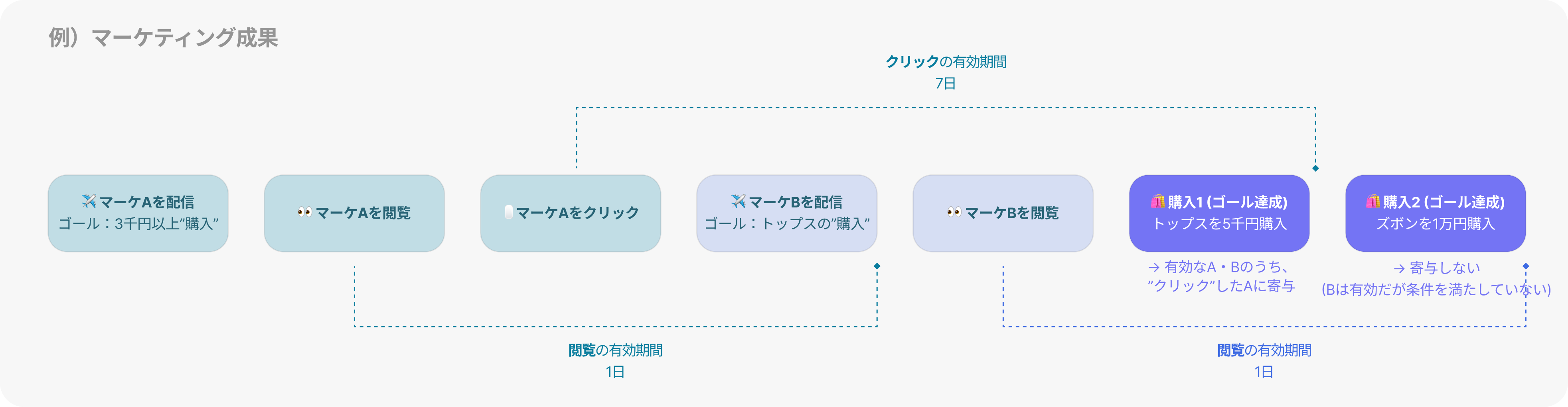 顧客がゴール行動(例:購入、会員登録)をしたとき、この行動に影響を与えたと判断できるマーケティング1つのみが成果として計測されます。判断基準は以下の通りです。