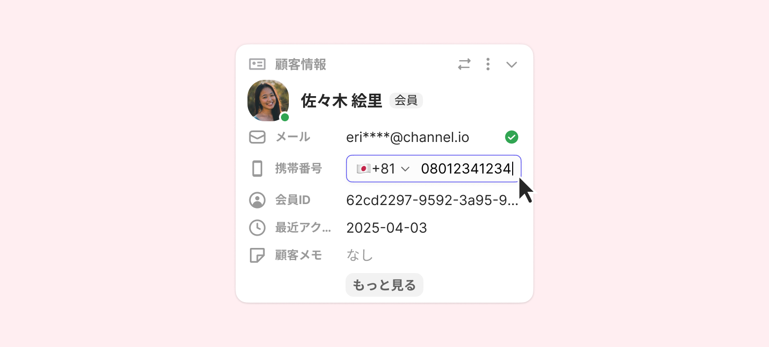 顧客プロフィール情報:携帯番号、メールアドレス、会社名などの収集した詳細情報が統合されます。
