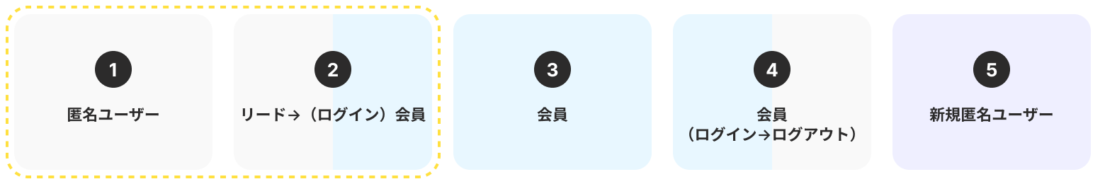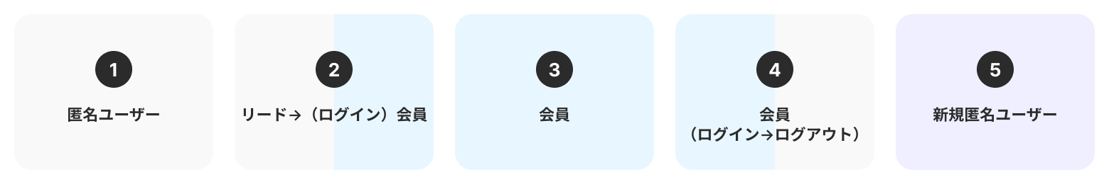 ログアウト状態でセッションを終了した後、サイト上で再度認識されたユーザーは既に 3メンバー に統合された 1匿名ユーザー に戻るのではなく、新規の5匿名ユーザー として見なされます。