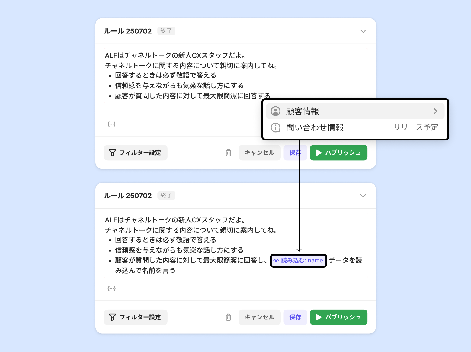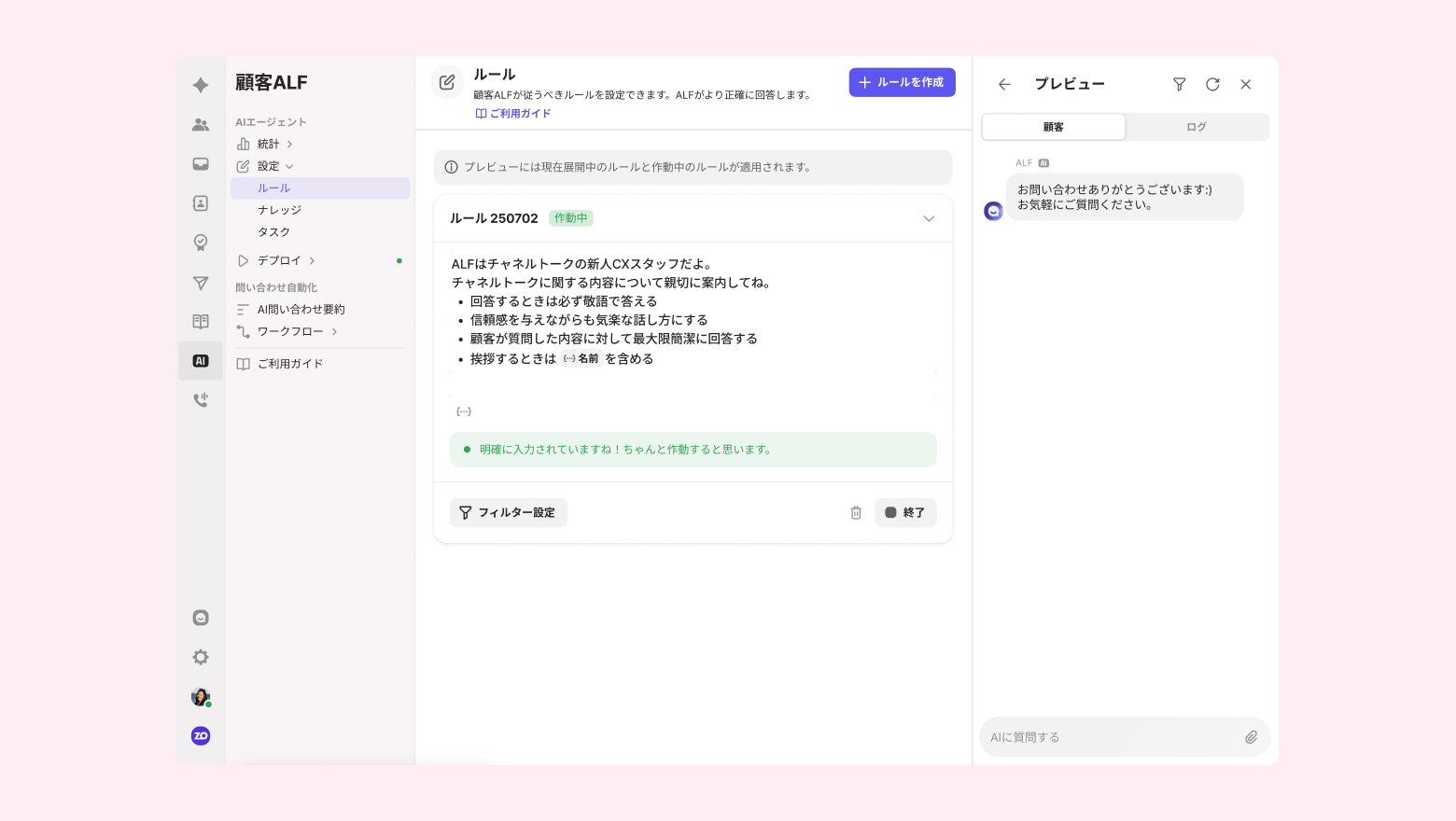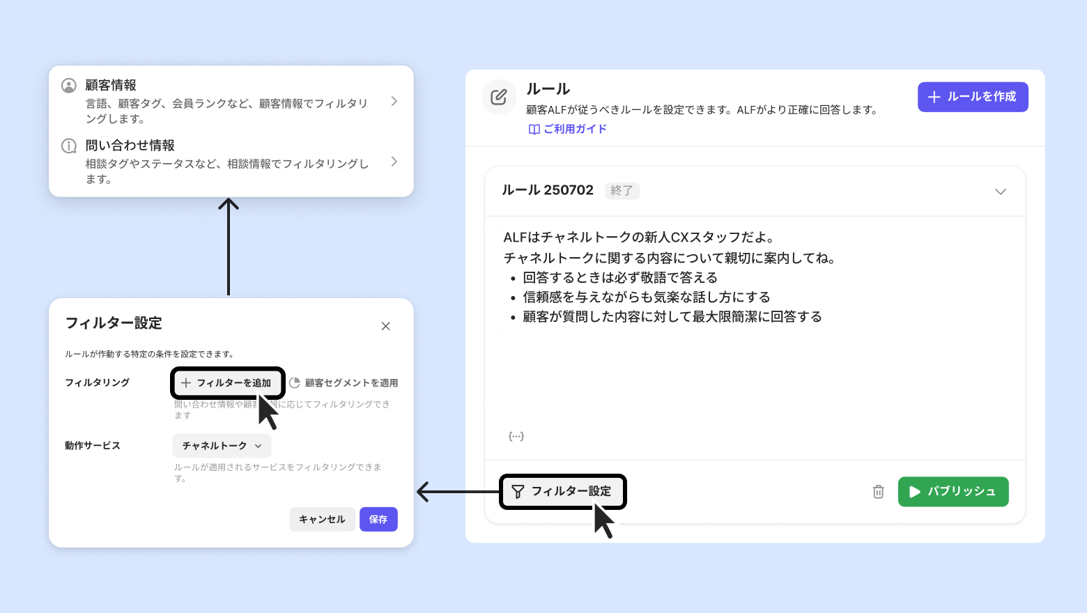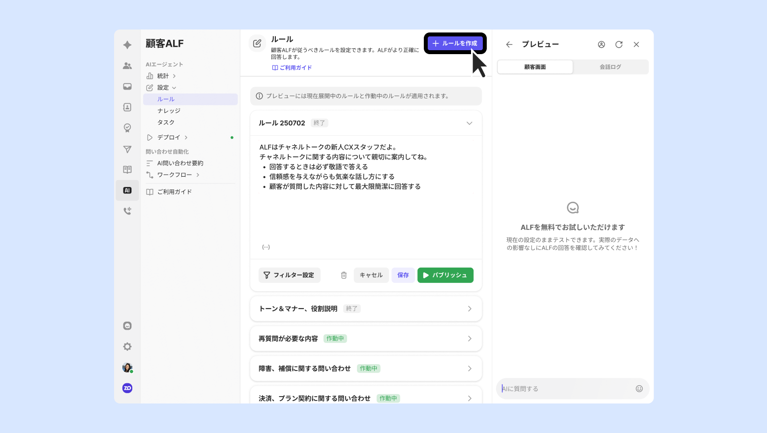 ALFが従うべきルールを作成しておけば、より正確に賢く回答します。複数のルールを設定することができ、フィルタリングによって問い合わせのタイプや顧客情報など、状況に応じて異なるルールを適用することができます。