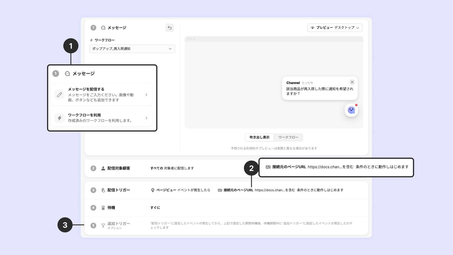 トリガーが「新しいチャットが開始するとき チャットボット」のワークフローの時のみ、ワークフローのポップアップ表示を使用できます。