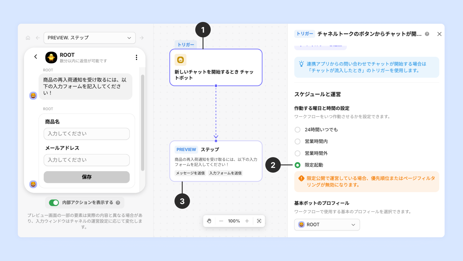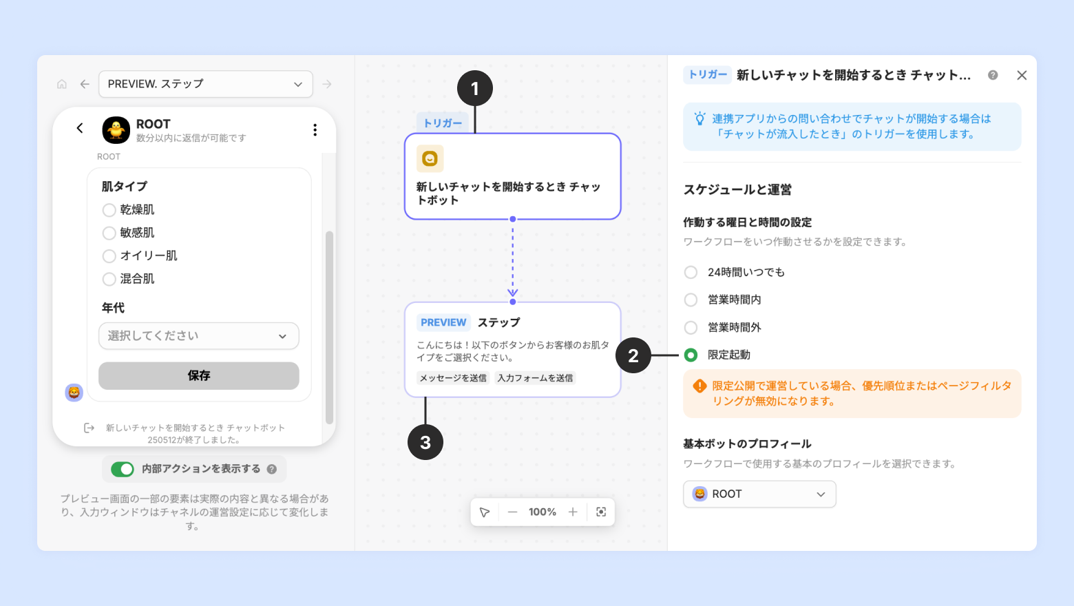 トリガーは「新しいチャットが開始するとき チャットボット」を設定し、営業時間は限定起動を選択します。