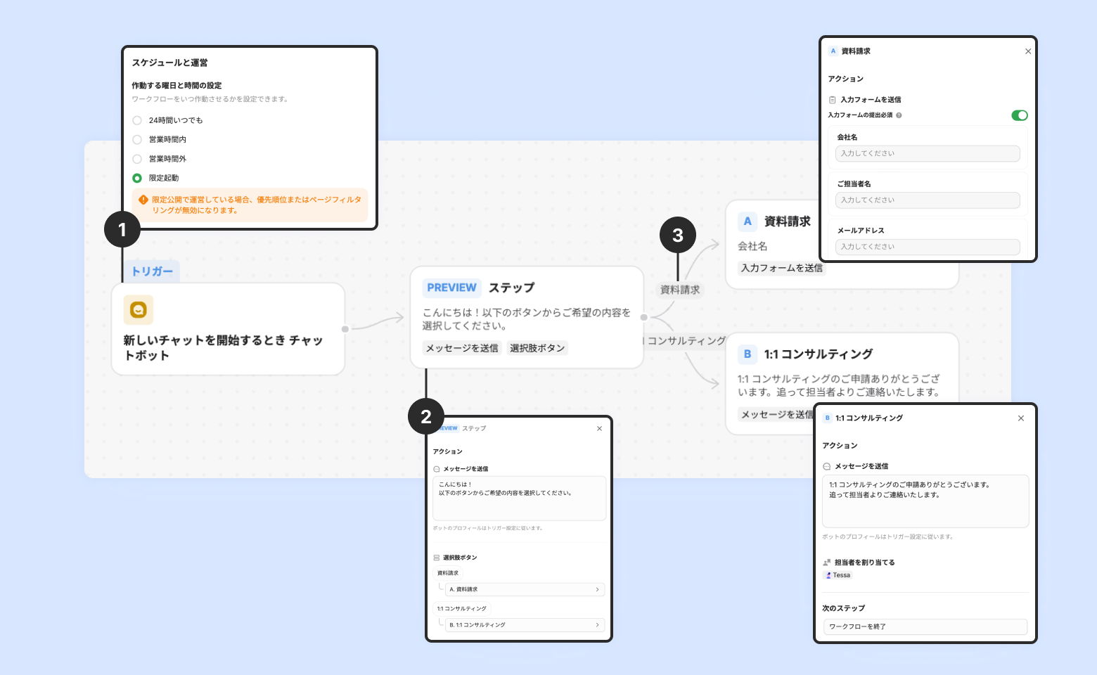 1) トリガー:新しいチャットが開始するとき チャットボット
