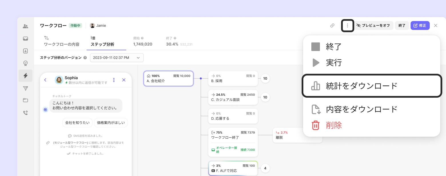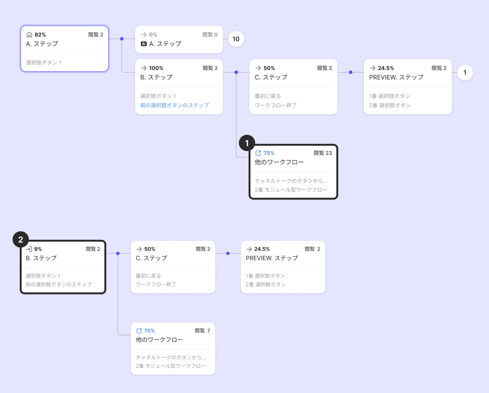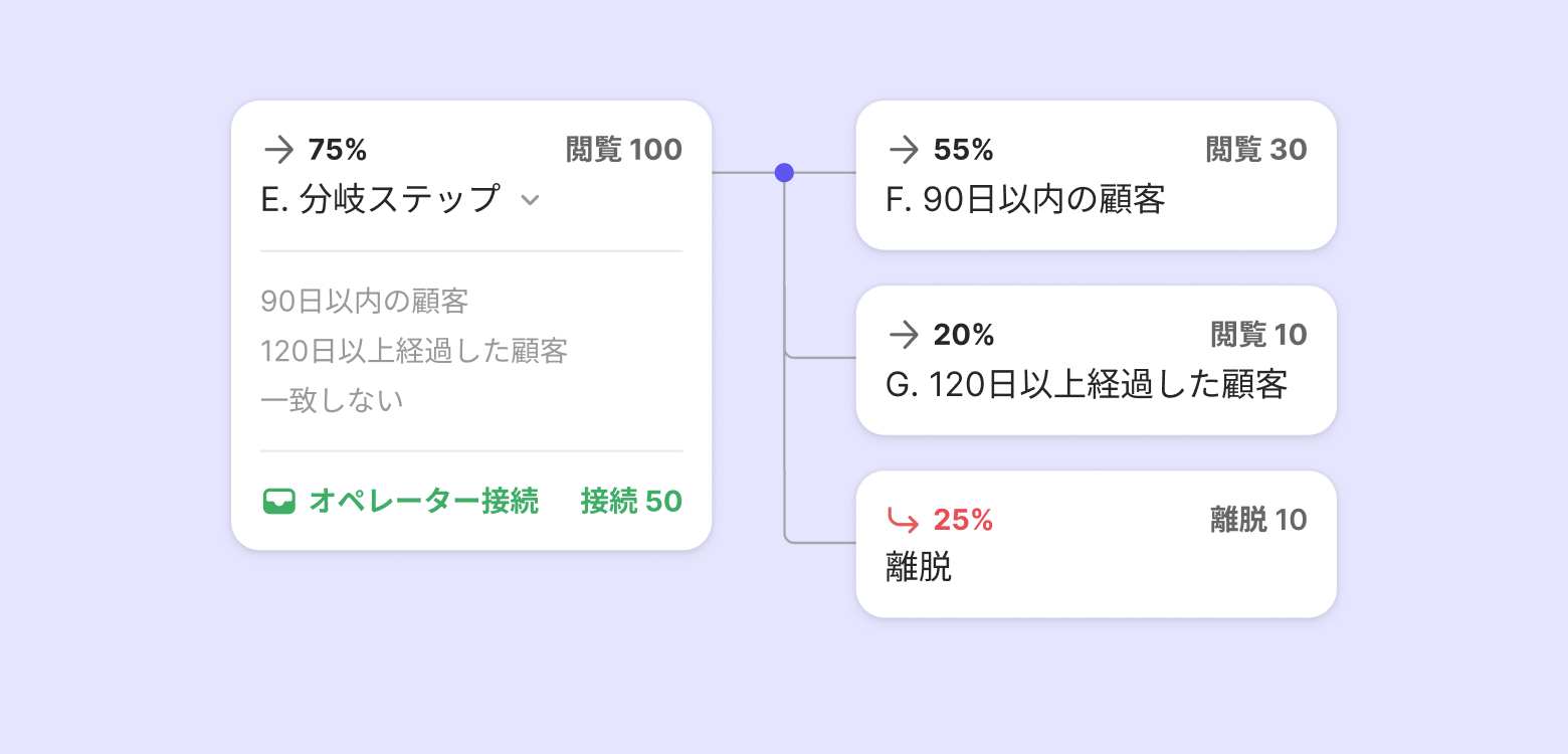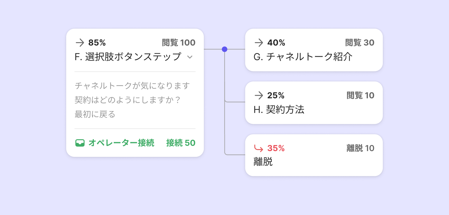 ステップを畳んで広げることができます。1つのボタンから次のステップに進むときは、丸の数字を押してください。数字は選択肢ボタンの数だけ表示されます。顧客がどのステップでどの選択をしたのかを見ることができます。