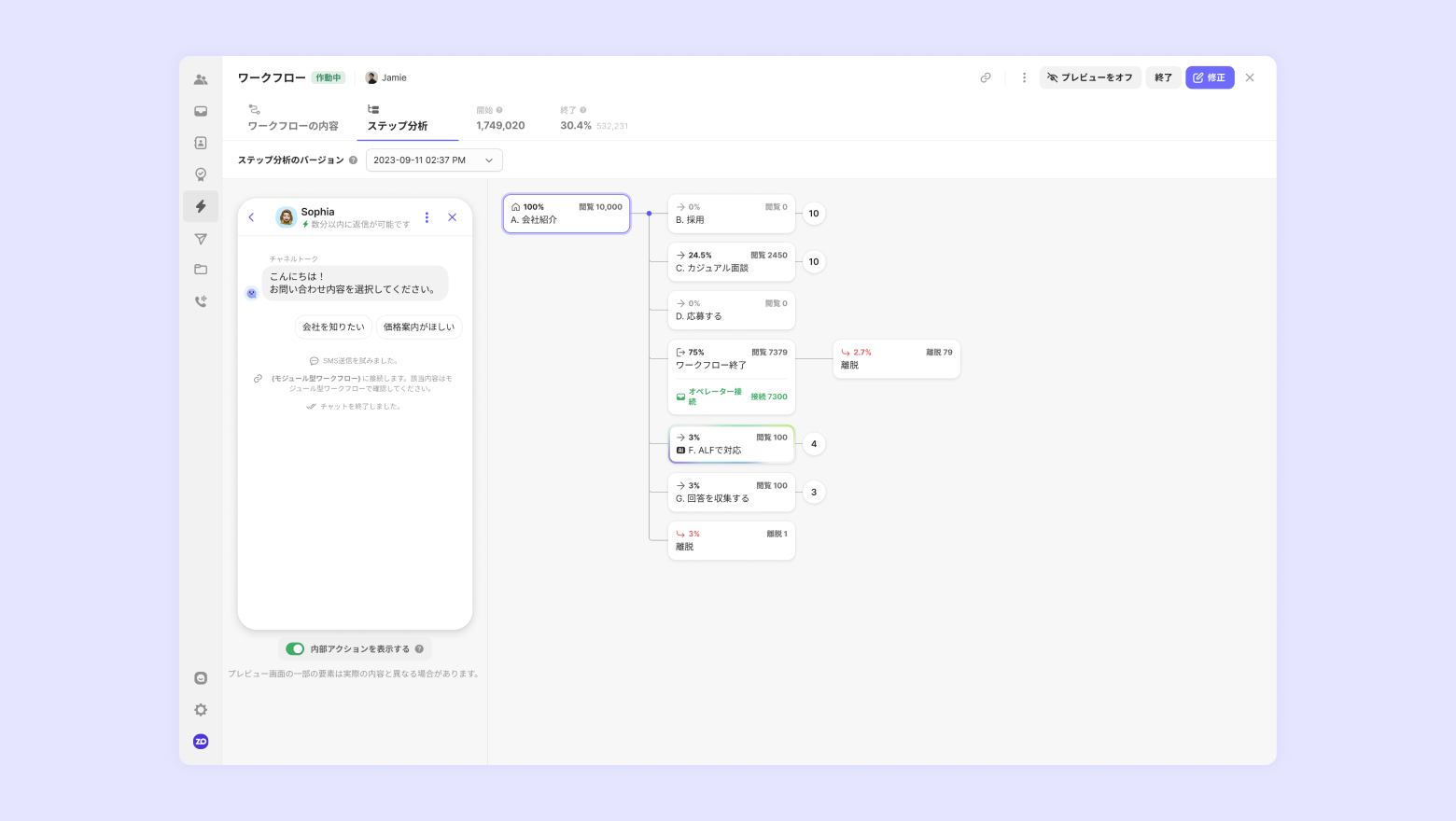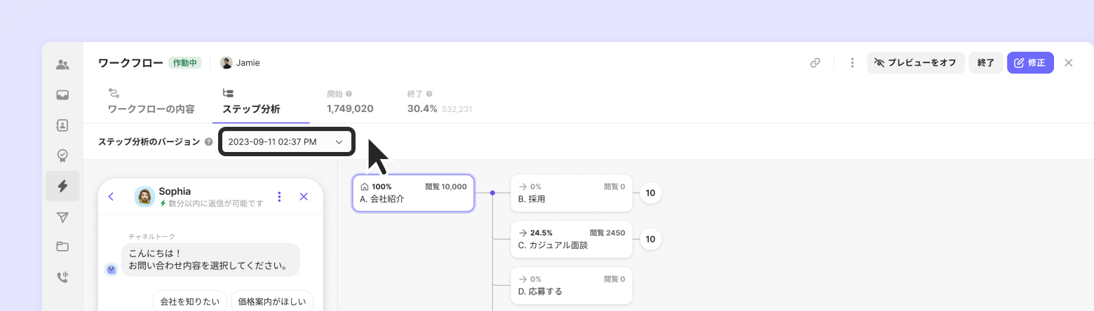 ステップ分析画面で各ステップの内容を確認することができます。左側のプレビュー画面で、選択したステップの顧客用画面を確認することができます。