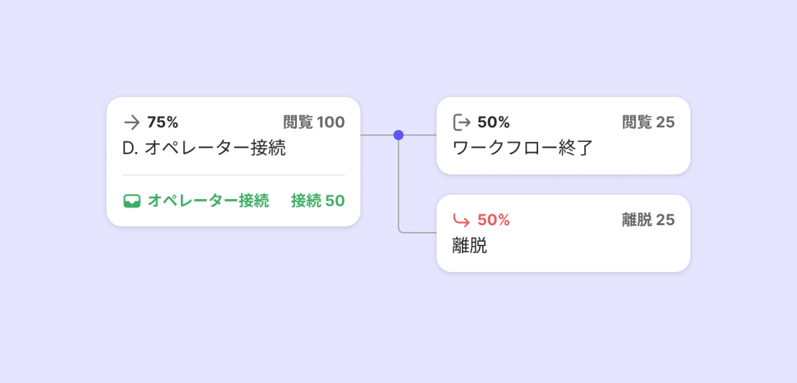 オペレーター接続があるステップでの離脱=オペレーター接続があるステップの閲覧ー(次のステップの閲覧の合計+ワークフロー終了)で計算されます。