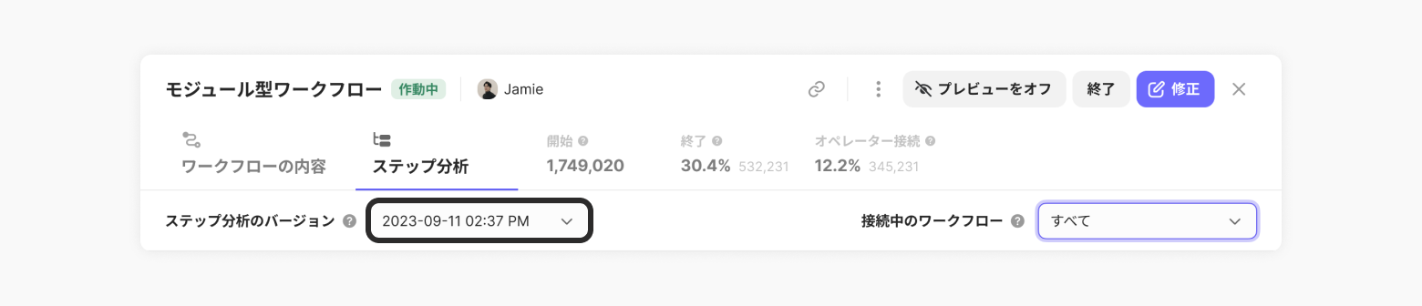ワークフローを実行すると、新しいバージョンとして保存/管理されます。"ステップ分析のバージョン" で希望するバージョンを選択し、該当バージョンのステップ分析を確認できます。