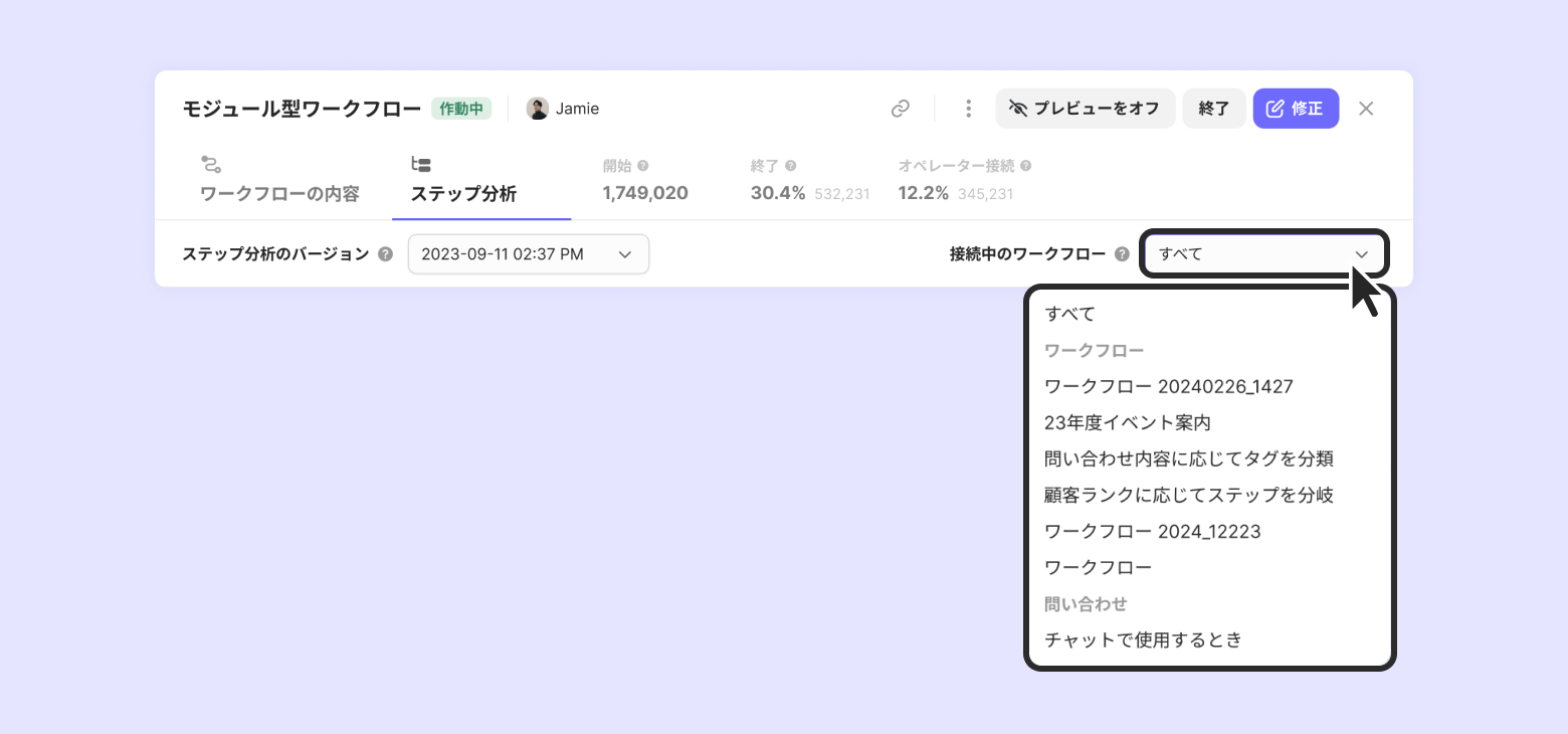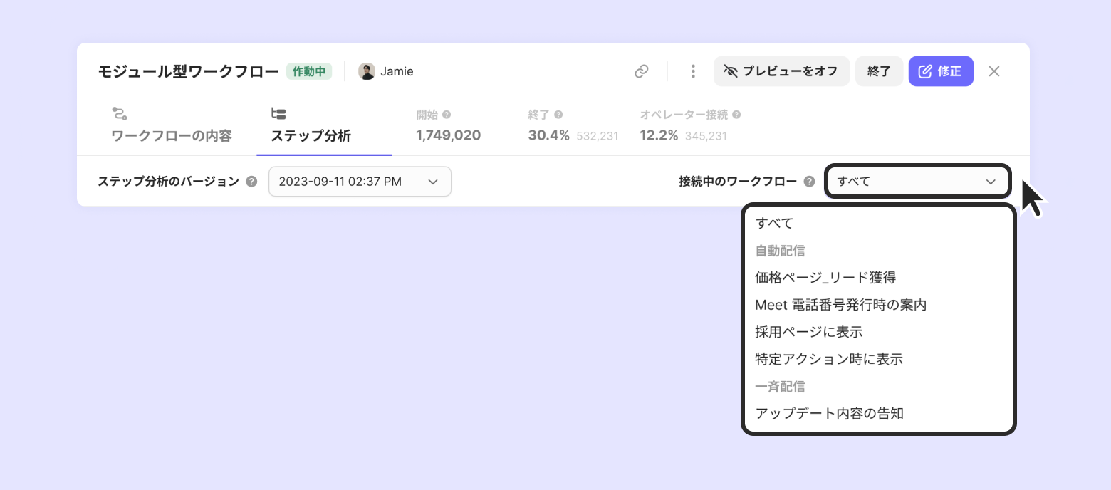 "接続中のワークフロー"リスト内の名前をクリックすると、モジュール型が接続されたワークフロー別のステップ分析を分けて確認できます。