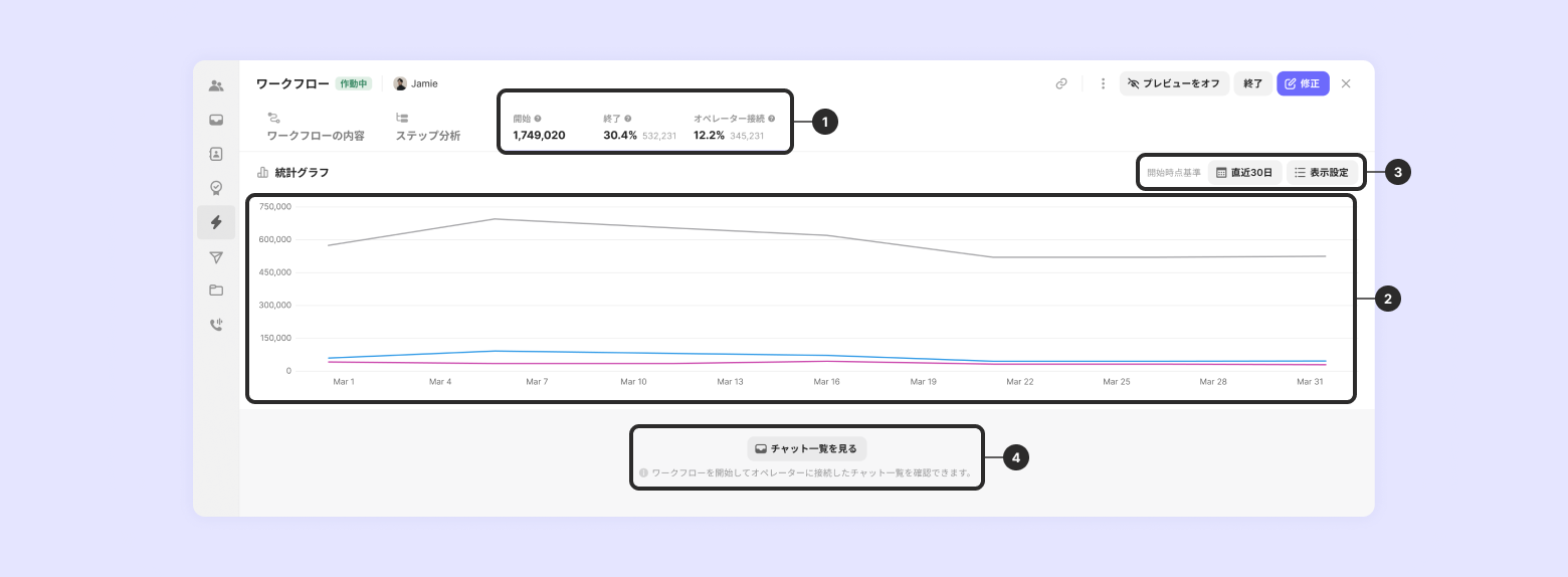オペレーター接続:「チャネルトークのボタンからチャットを開始するとき」トリガーでのみ確認でき、ワークフローのフローで "初めて" チャットが開かれたもののみを数値で表示します。