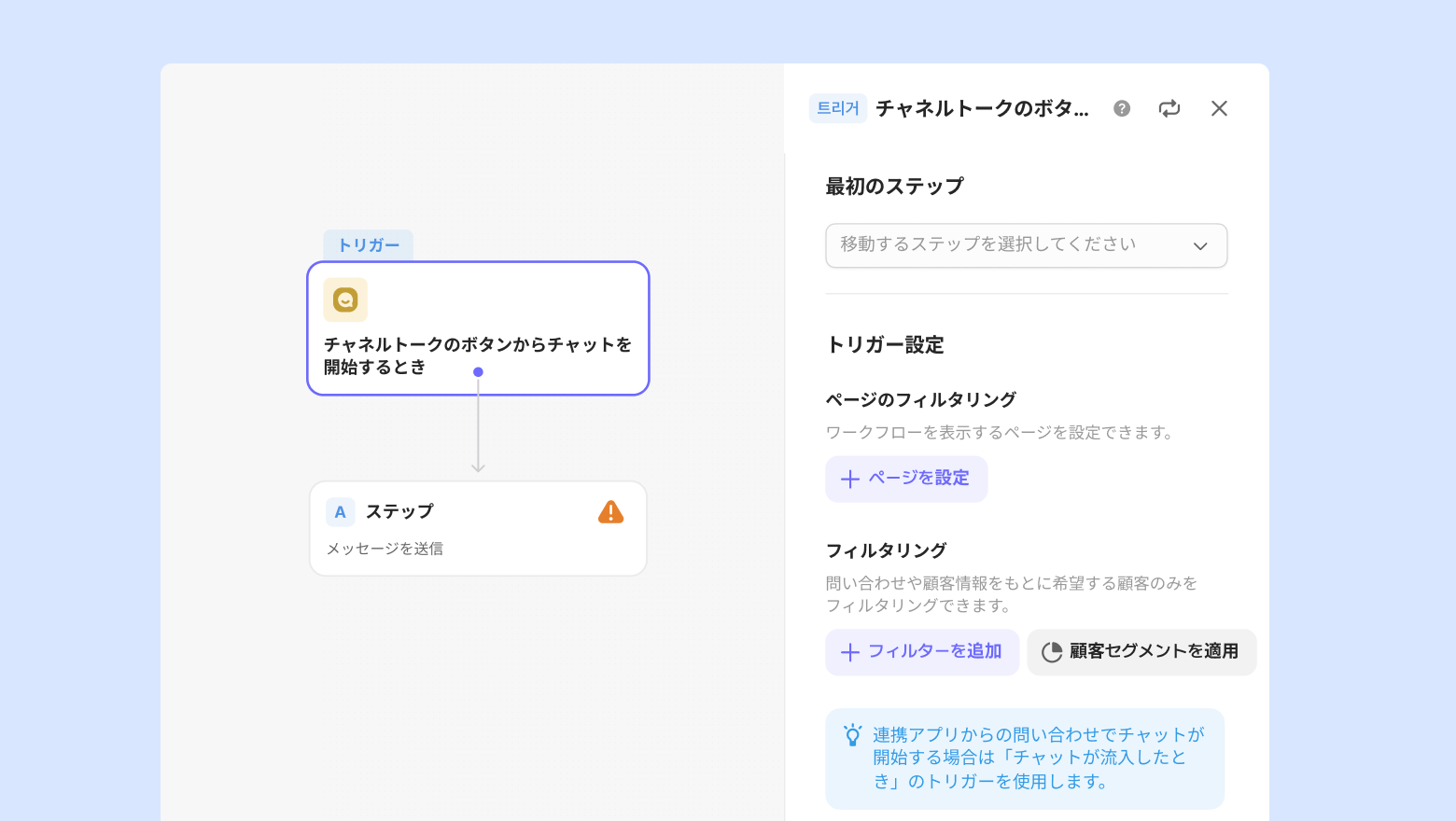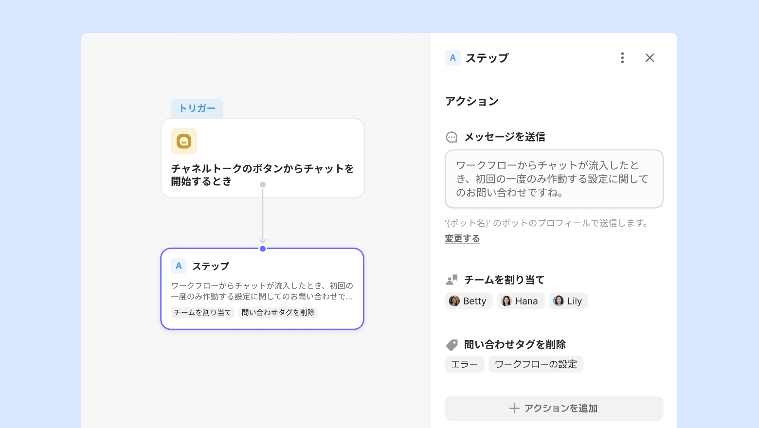 ステップは複数のアクションで構成されているブロックです。顧客に伝えるメッセージと選択肢ボタンを使用してチャットボットのように設定することもでき、どのタグを付けるか、どのチームに割り当てられるかも設定できます。