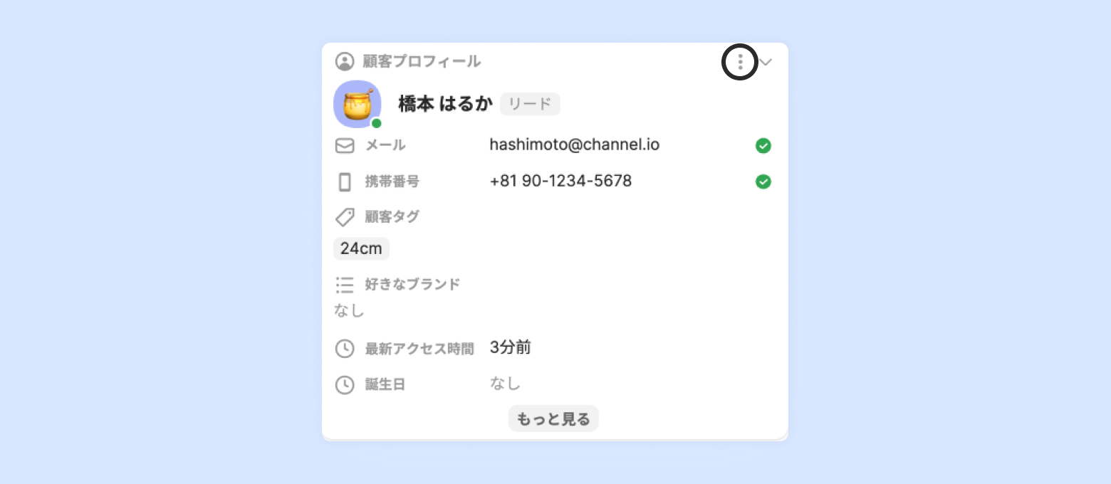 チャネルトークと自社サイトの連携された顧客情報の中にnumber値が含まれていると、顧客情報ページの連携が可能です。
