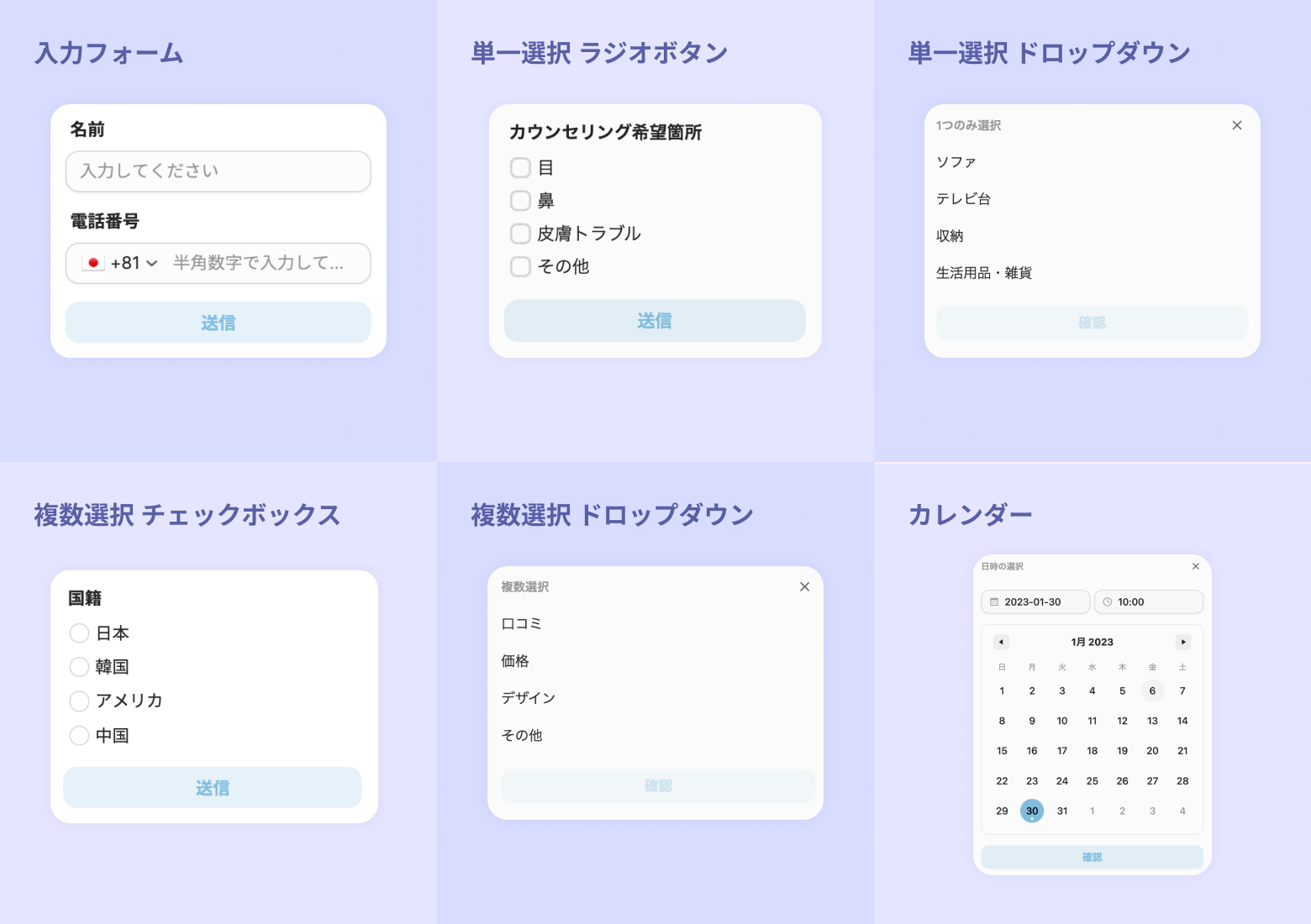 List (文章形式、複数選択可能) | 複数選択チェックボックス、複数選択ドロップダウン |