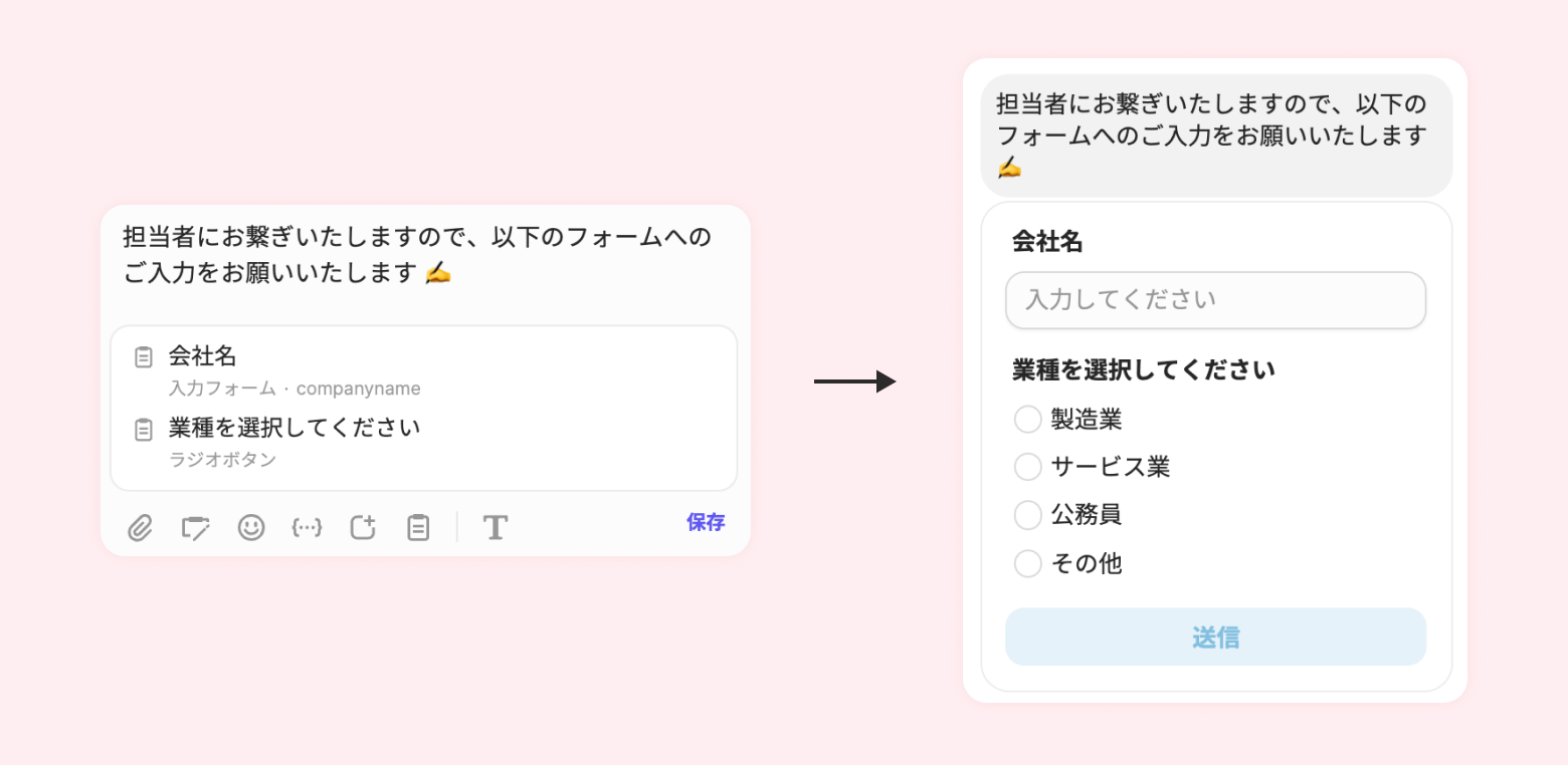 チャット対応中、マクロ、ワークフローで入力フォームを設定すると顧客に送信できます。