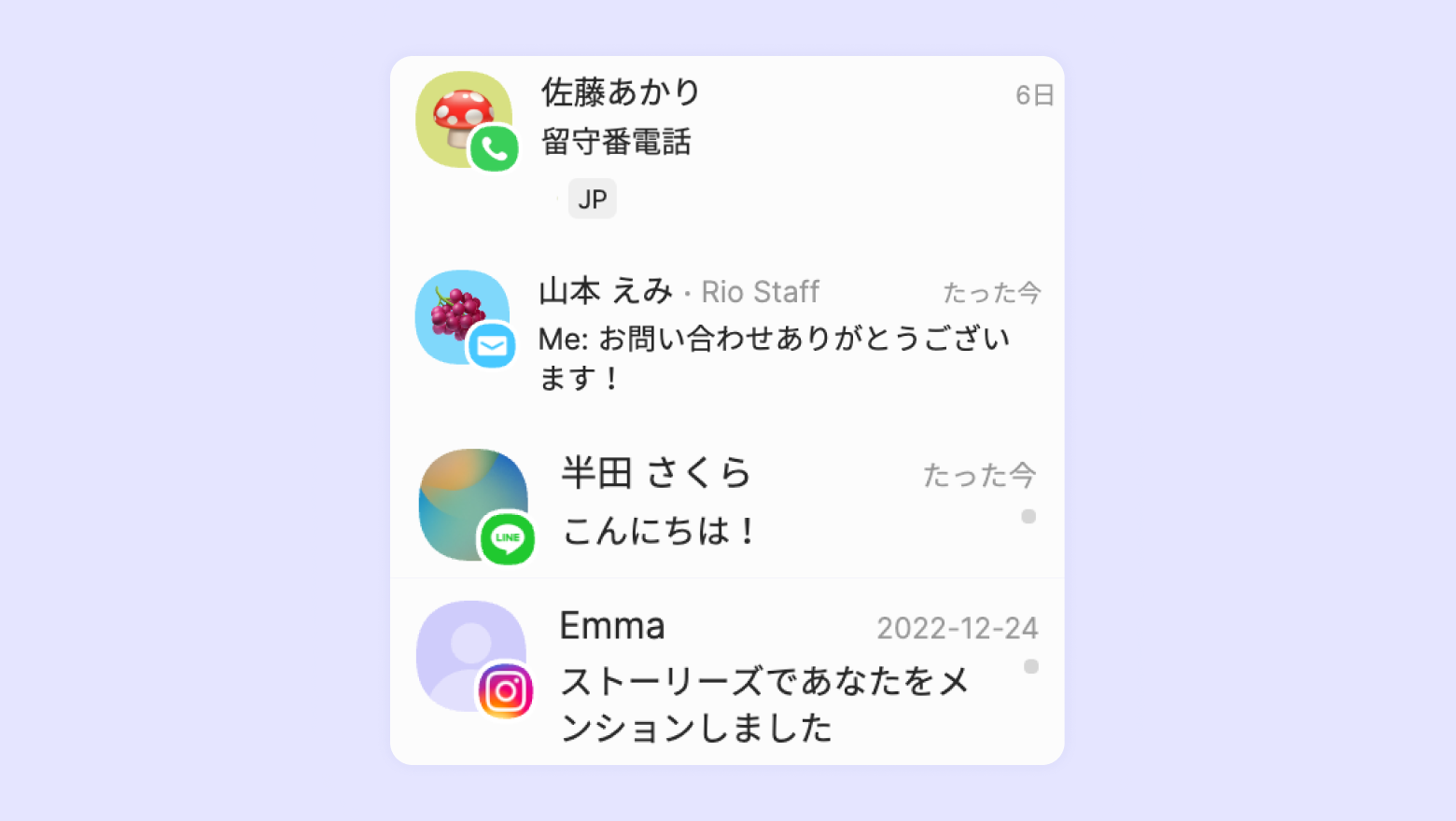 InstagramのDMやLINEなどから送られてきたチャットは、顧客のプロフィール写真の右下に、そのメッセンジャーのアイコンが表示されます。