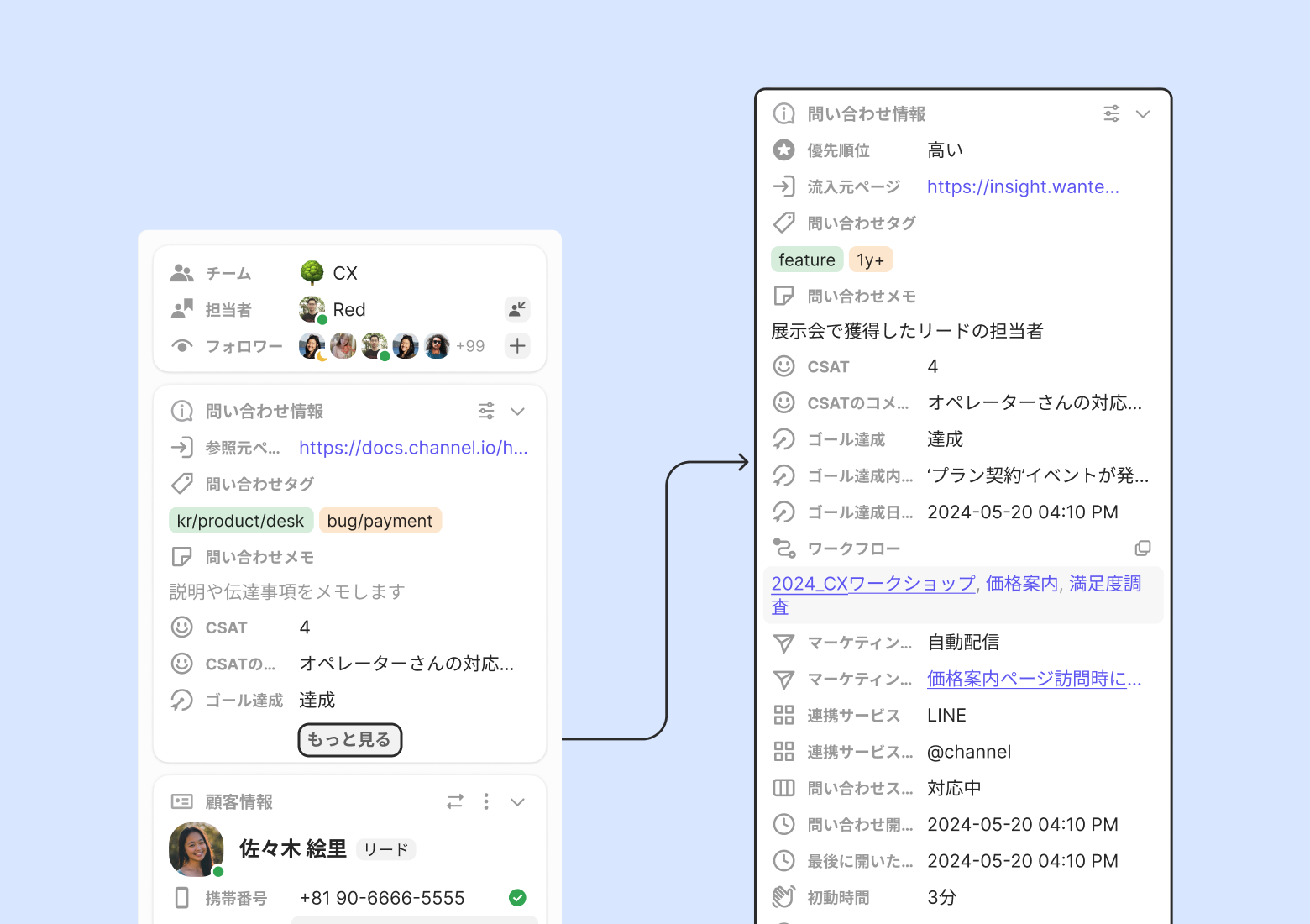 1人の顧客が何度問い合わせを行っても、問い合わせの優先順位、流入ページ、問い合わせ満足度など、問い合わせ別に必要な情報をそれぞれ管理することができます。