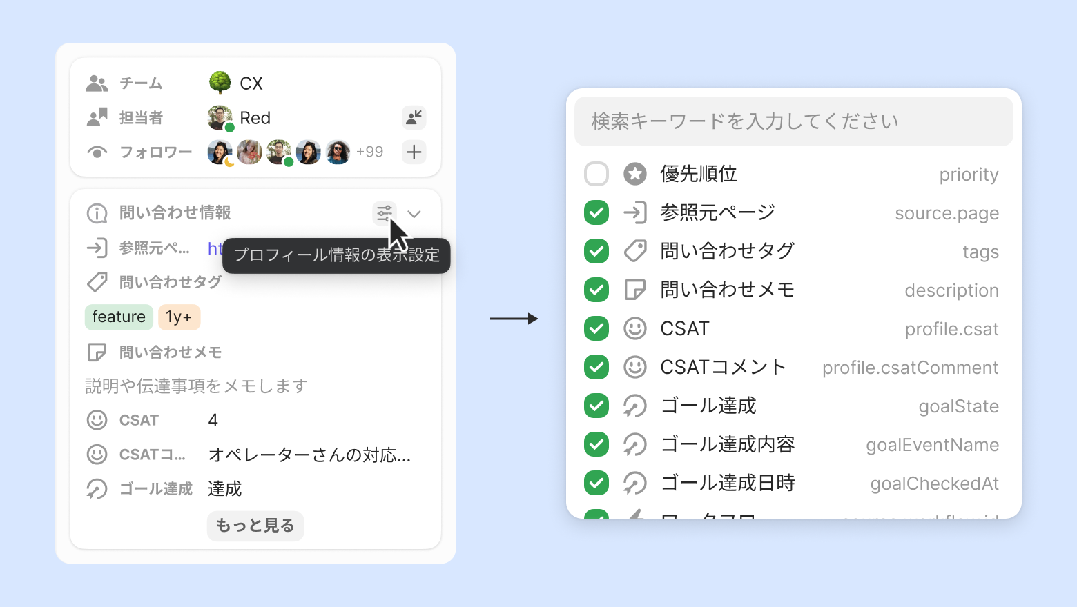 問い合わせプロフィールも詳細画面に入ると問い合わせステータス、流入ページ、問い合わせタグなどの問い合わせに関する情報を一目で確認できます。[プロフィール情報の表示設定] を押し、希望する情報のみを表示するように設定することができます。