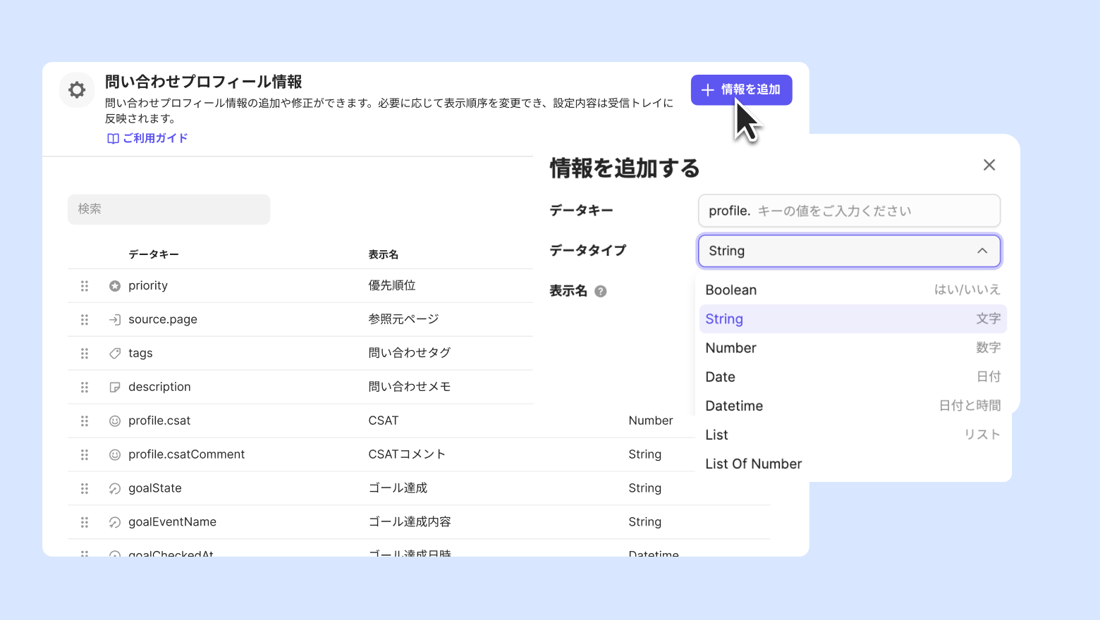 問い合わせプロフィールを追加し、修正することができます。必要に応じて並び順を変更することができ、設定したデータは受信トレイに適用されます。