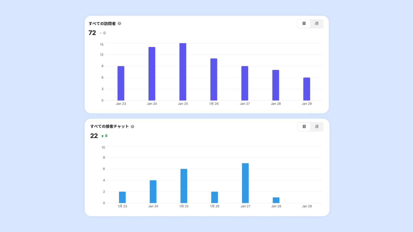 設定した期間のすべての訪問者、すべての接客チャット、時間と曜日別に開始または終了したチャットの数、問い合わせタグ、ページ、流入経路を確認することができます。