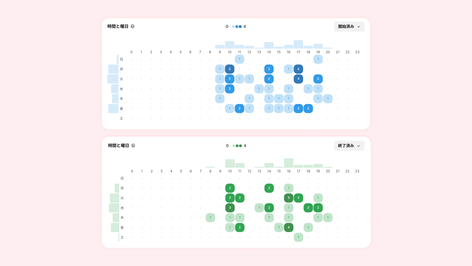 期間内に開始/終了したチャットを、時間と曜日別に分布させて確認する