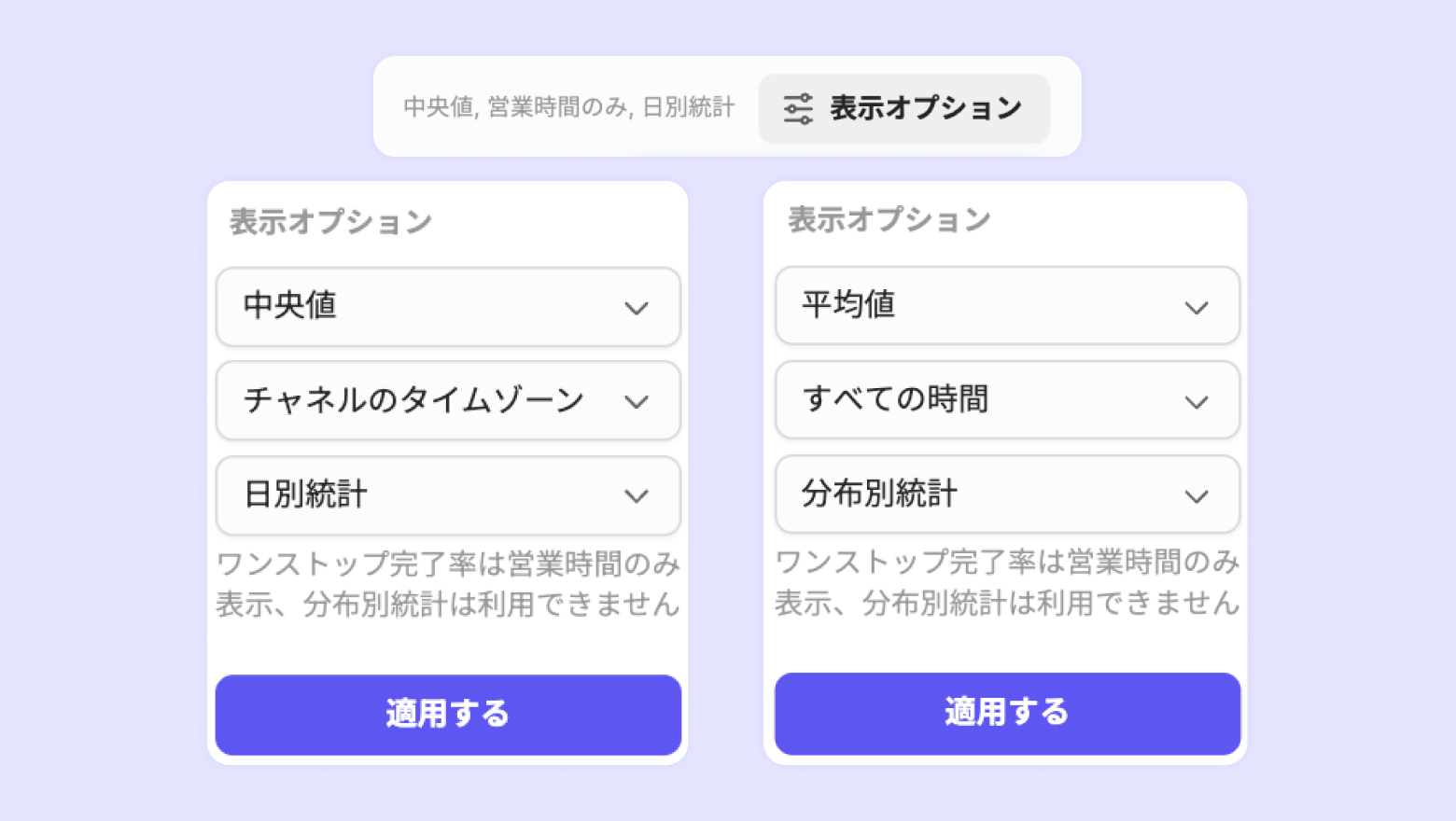 表示オプションで、すべての時間 / 営業時間、平均値 / 中央値の設定が可能です。