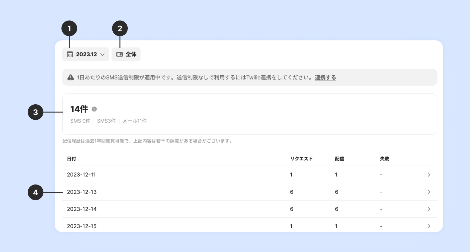 日付別の配信履歴:日付をクリックすると、その日に配信された履歴の詳細を確認できます。
