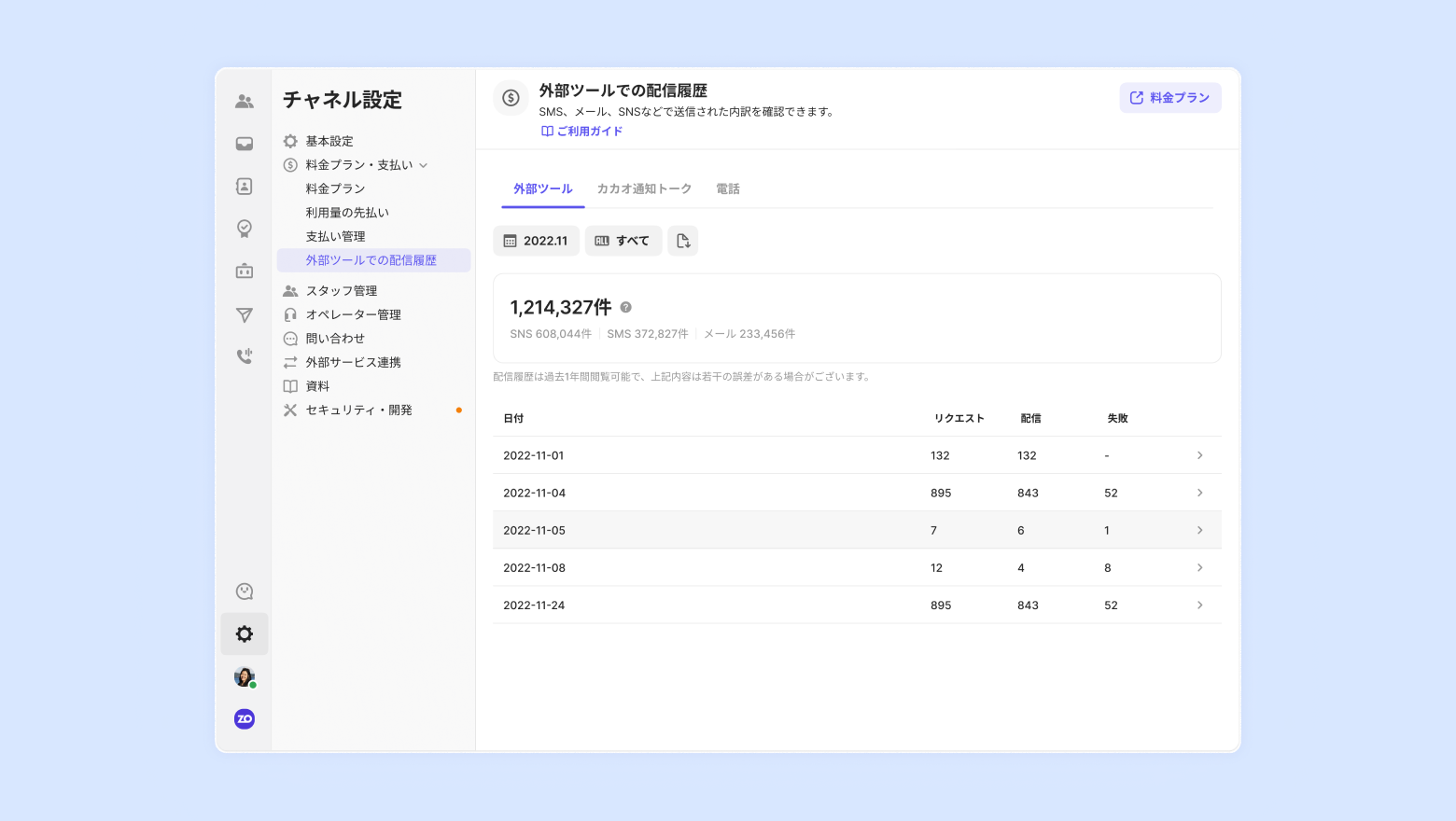 外部ツール:返信通知、マーケティング、カカオ通知トークで配信された内訳を確認できます。月別、日別に配信したマーケティング別に区分して確認可能です。