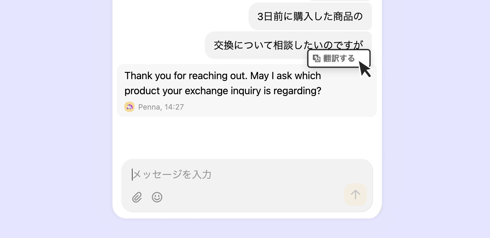 顧客またはチームメンバーが送信したメッセージが自分の言語と異なる場合、送信者のプロフィール右側に [翻訳する] オプションが表示されます。