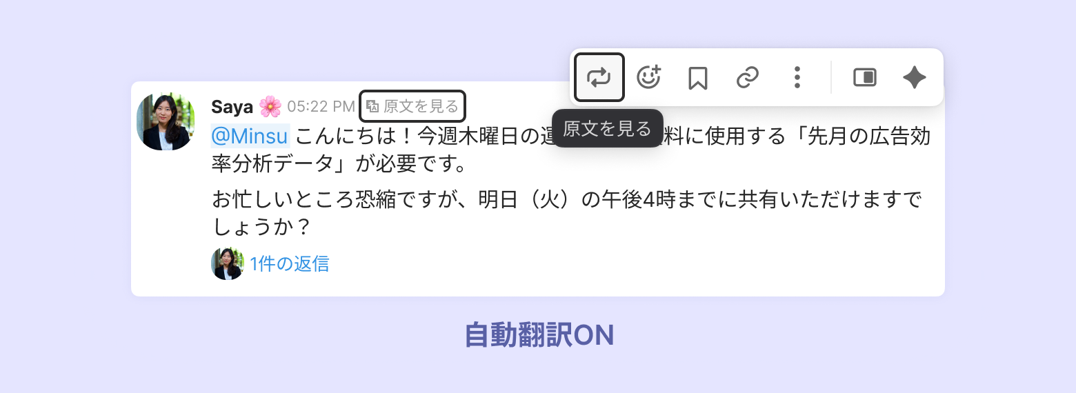 自動翻訳ON:[除外する言語] で指定した言語以外を自動で翻訳します。[原文を見る] をクリックすると送信された元の言語でメッセージを確認できます。