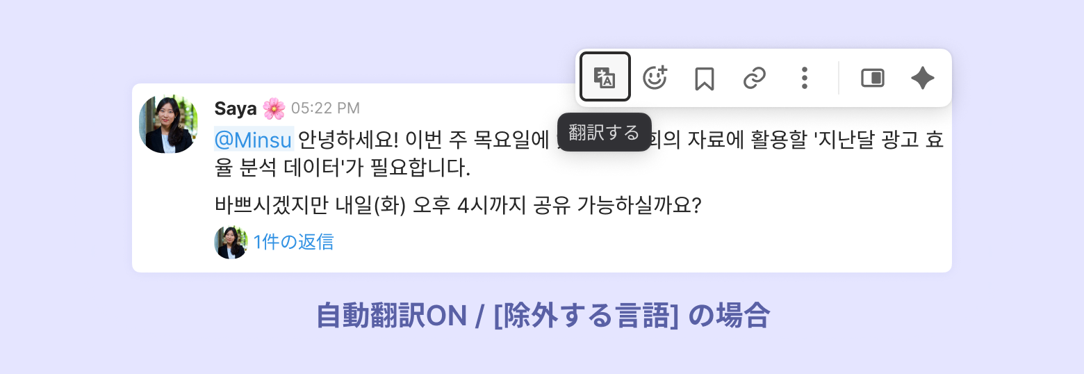 [除外する言語] で指定した言語の場合、メッセージの上にマウスを乗せて [翻訳する] をクリックすると翻訳できます。
