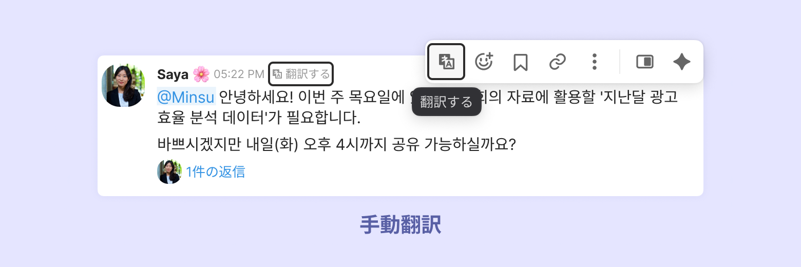 手動翻訳:メッセージの上にマウスを乗せて [翻訳する] をクリックすると、メッセージを翻訳できます。