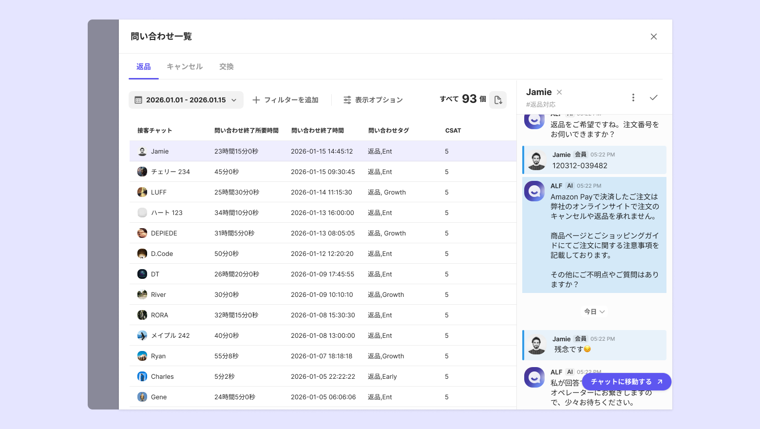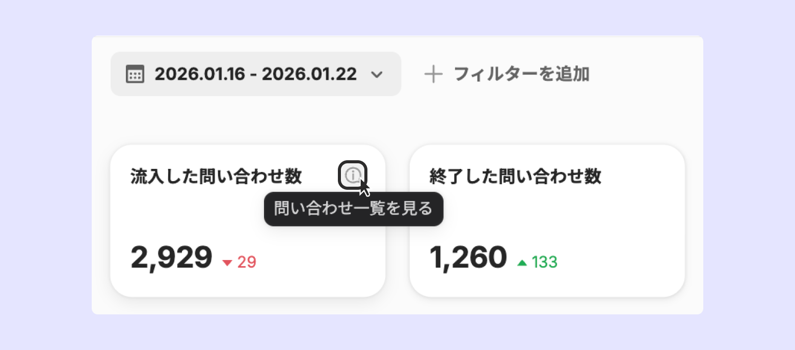 問い合わせ一覧で期間とフィルターを変更しても、レポートやチャートの設定は変更されません。
