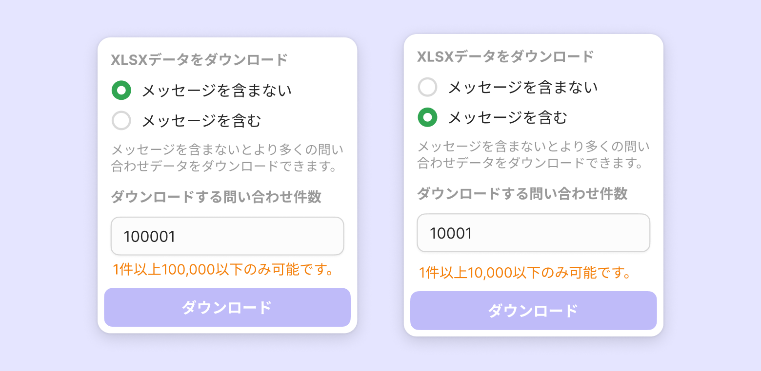 問い合わせ一覧で設定した期間とフィルターで照会された問い合わせのみダウンロードできます。