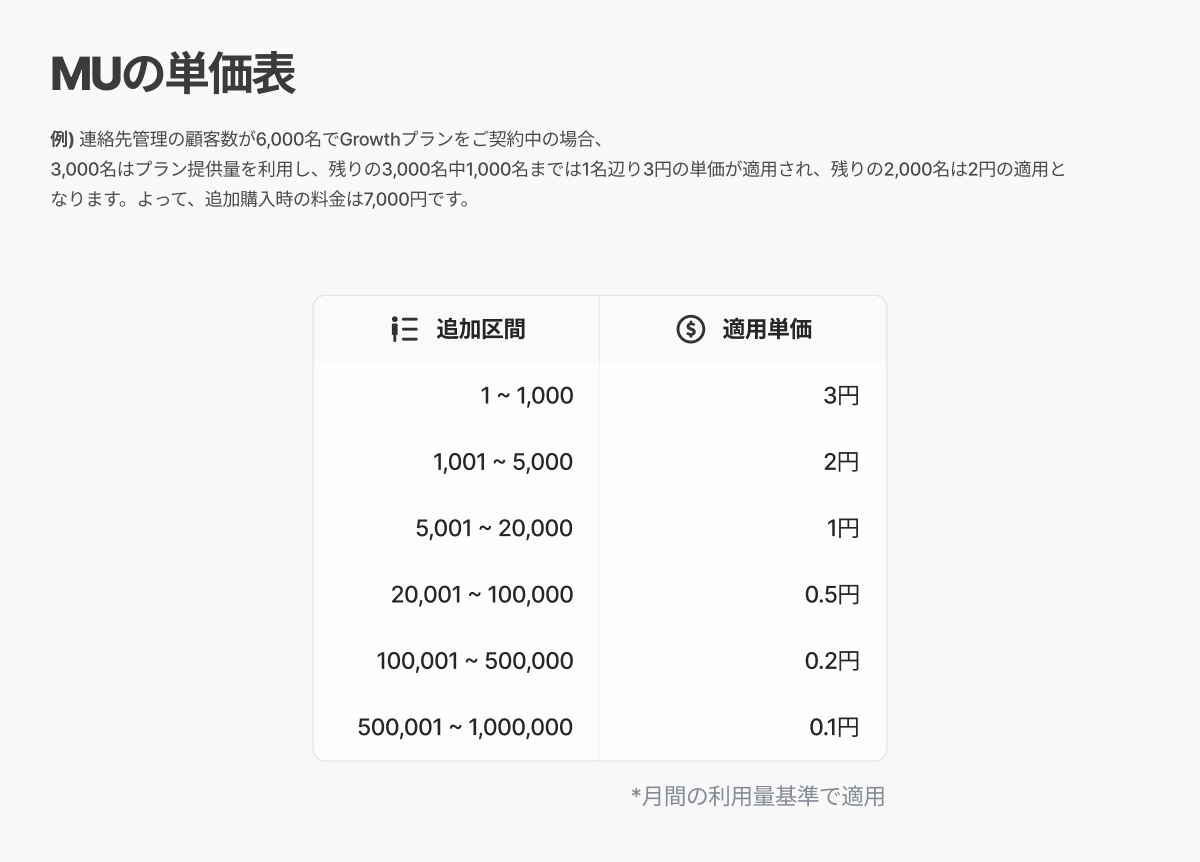 例)Growthプランで顧客情報を3,000人を追加した場合 (連絡先管理に保存されている顧客数は全6,000人) 1,000人 x 3円 = 3,000円 2,000人 x 2円 = 4,000円 追加で発生する料金の総額は7,000円で、上記のように追加件数に応じて単価が異なります。