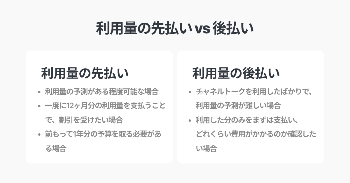 従量課金分は後払いでの支払い・利用量の先払いの2つの方式でお支払いいただけます。