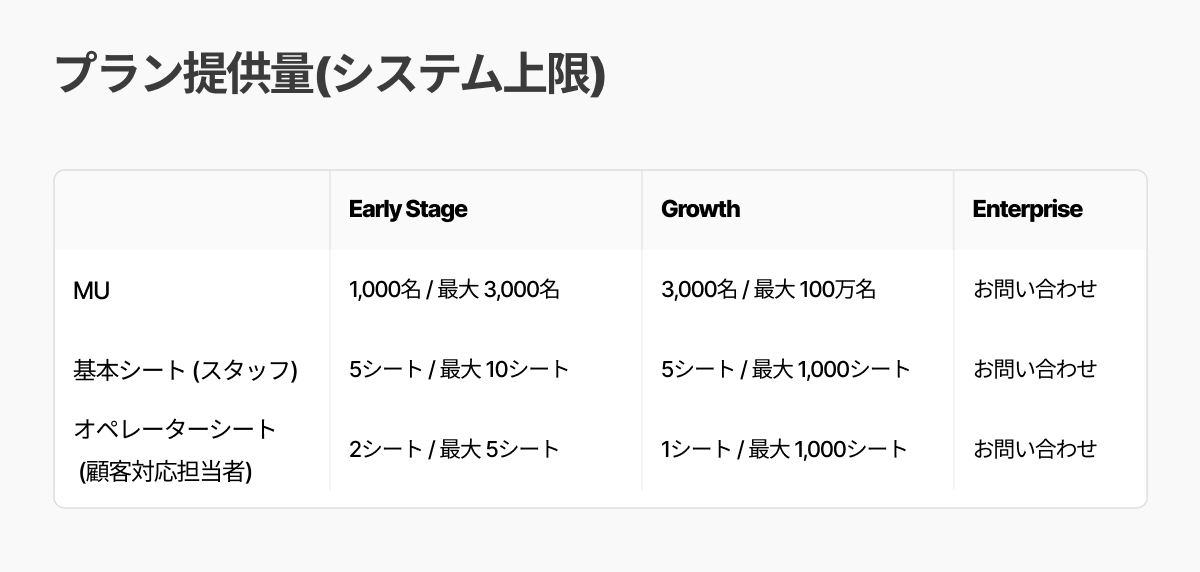 上記でご案内したように、プランには、MU・オペレーターシート・チームメンバーシートが含まれており、プランごとに提供されるMUやシート数(プラン提供量と呼びます)は異なります。