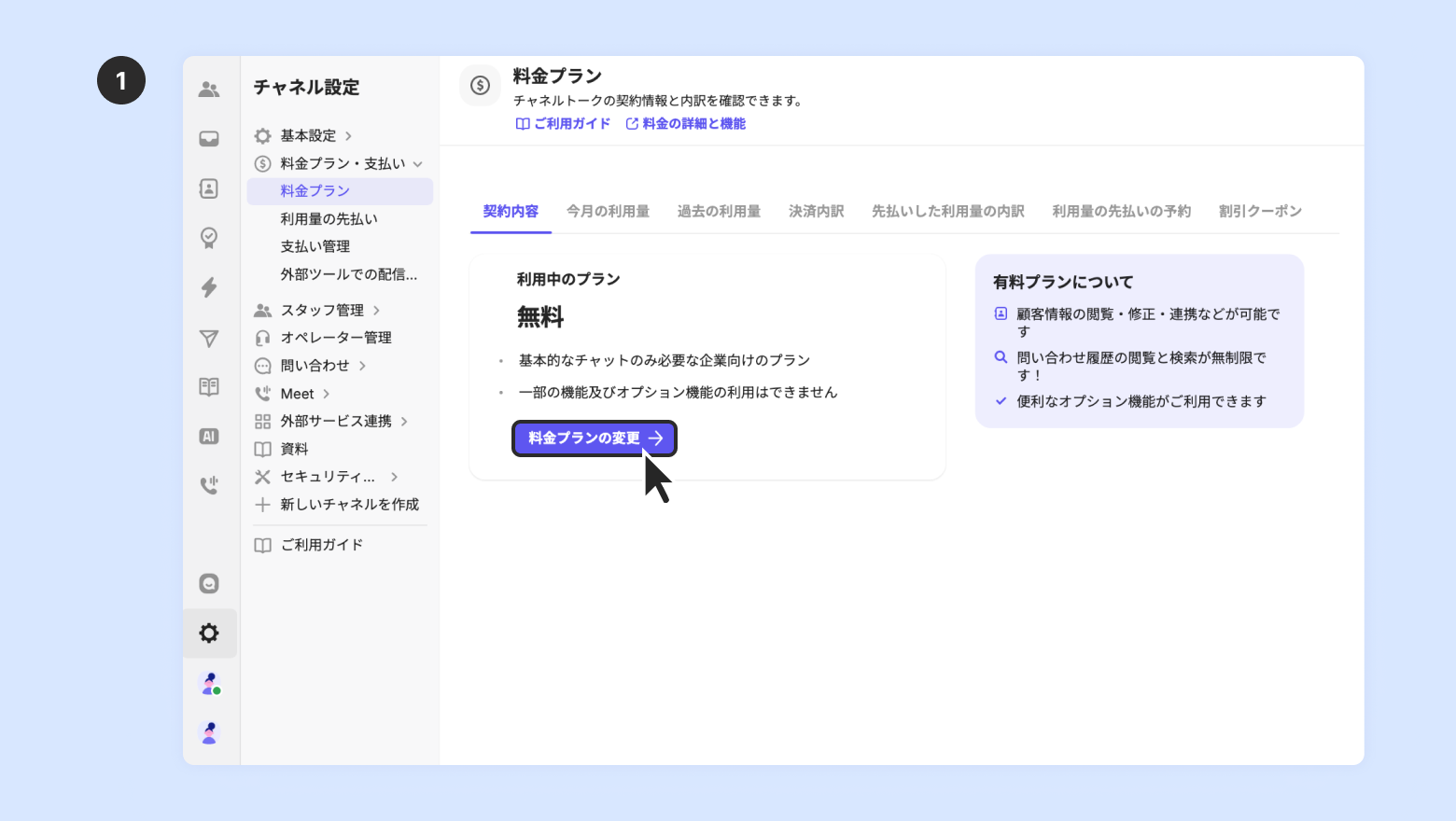 [チャネル設定] - [料金プラン・支払い] - [料金プラン] - [契約内容] で [プランの設定] をクリック