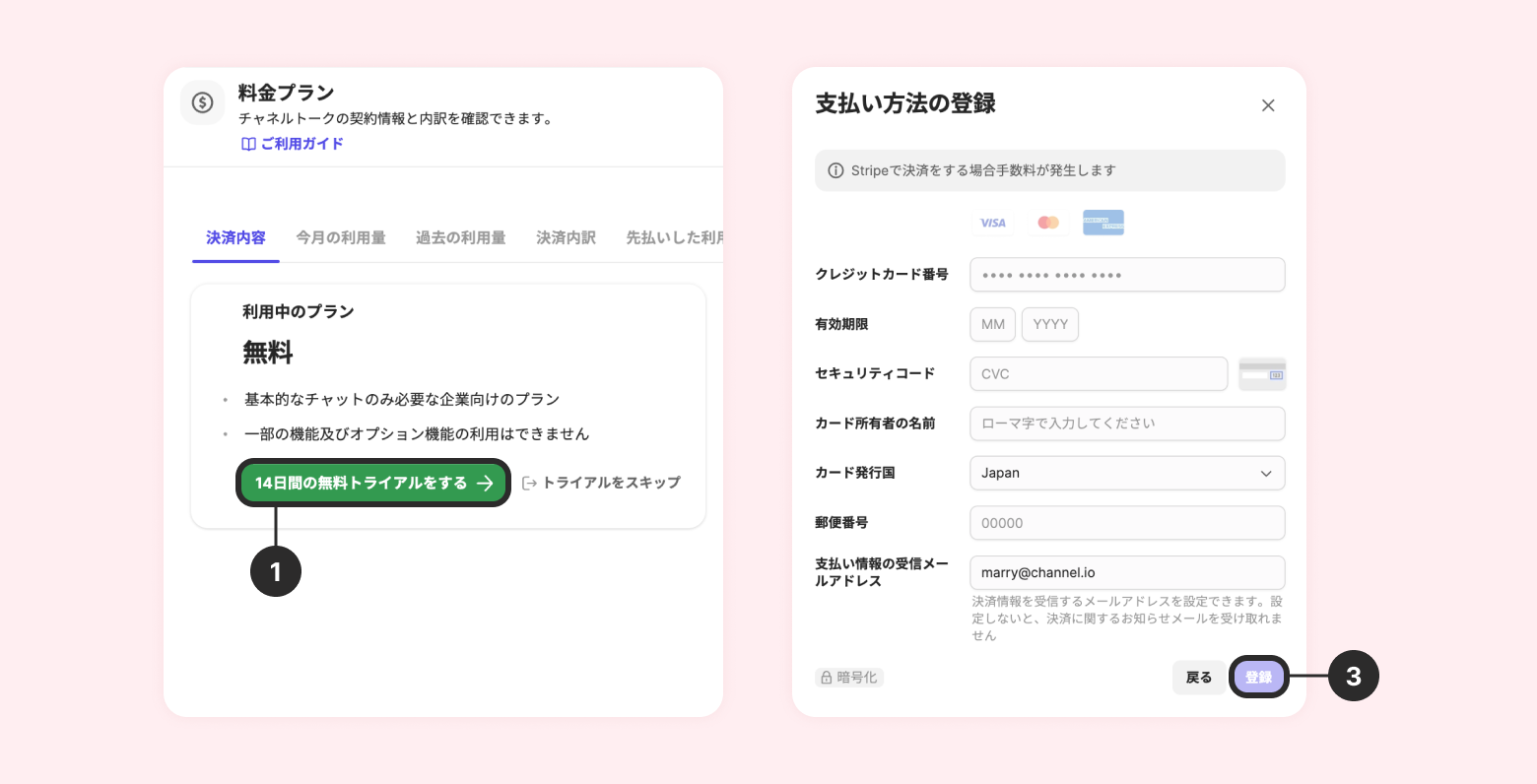 [チャネル設定] - [料金プラン・支払い] - [料金プラン] で、[14日間の無料トライアルをはじめる]ボタンをクリックしてください。