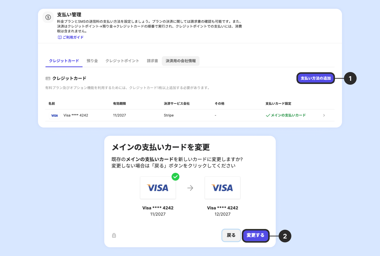 [メインの支払いカード] をクリックし、メインの支払いカードを設定すると次回の決済日から変更されたカードでの決済が実行されます。