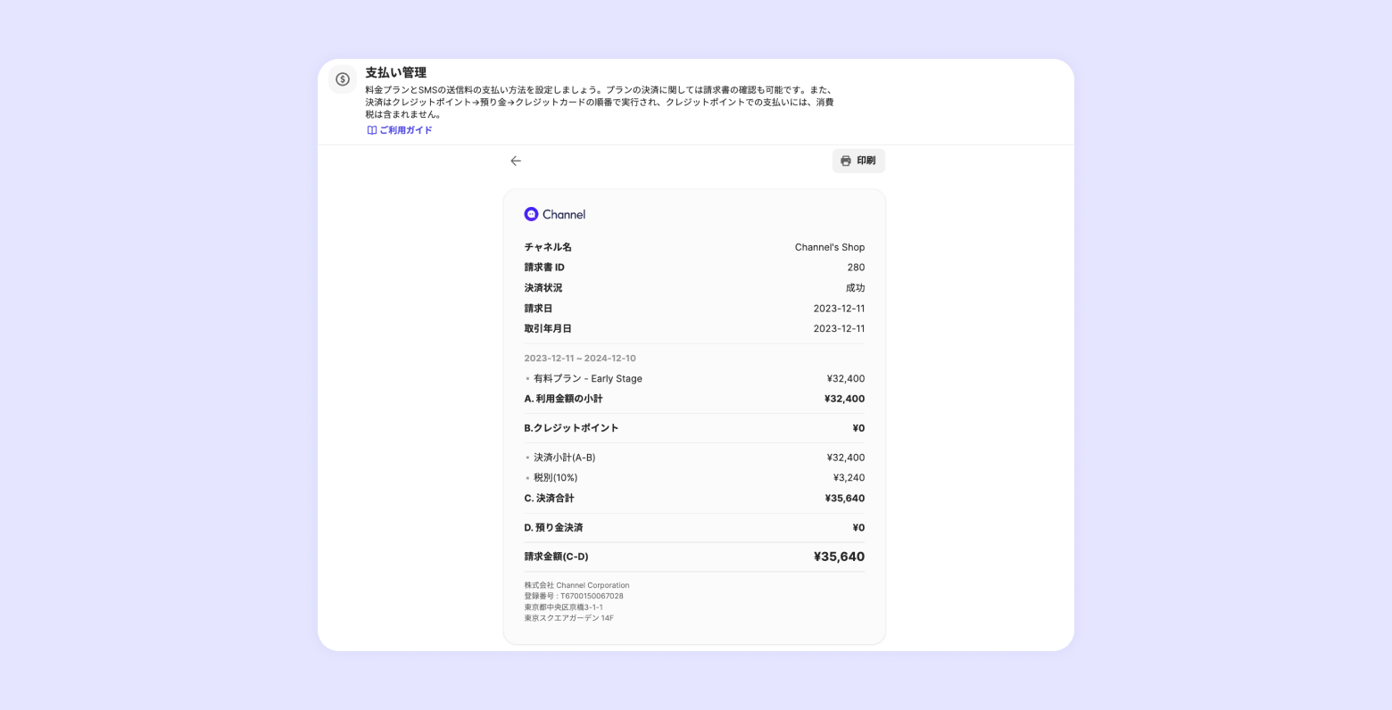 [チャネル設定] - [料金プラン・支払い] - [支払い管理] の請求書タグよりご確認いただくことができ、個別に印刷も可能です。