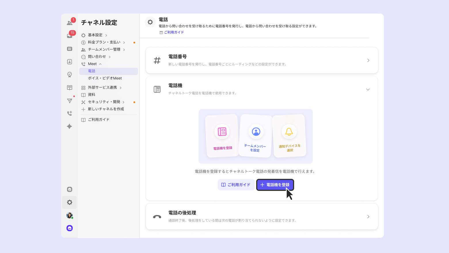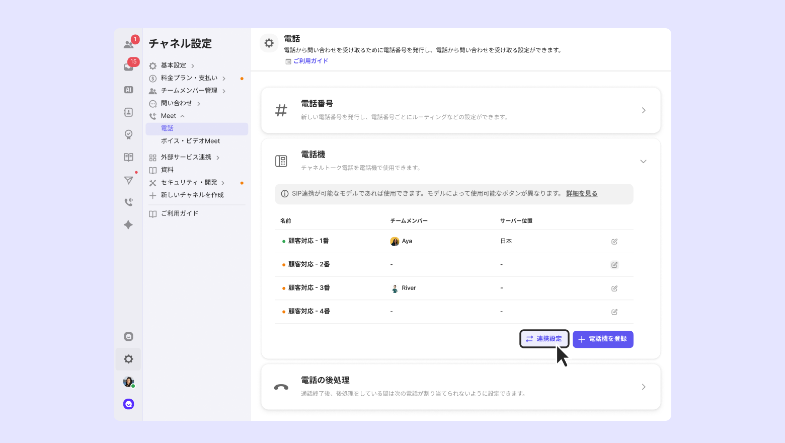 チャネルトークでチームメンバー別に仮想電話機を登録