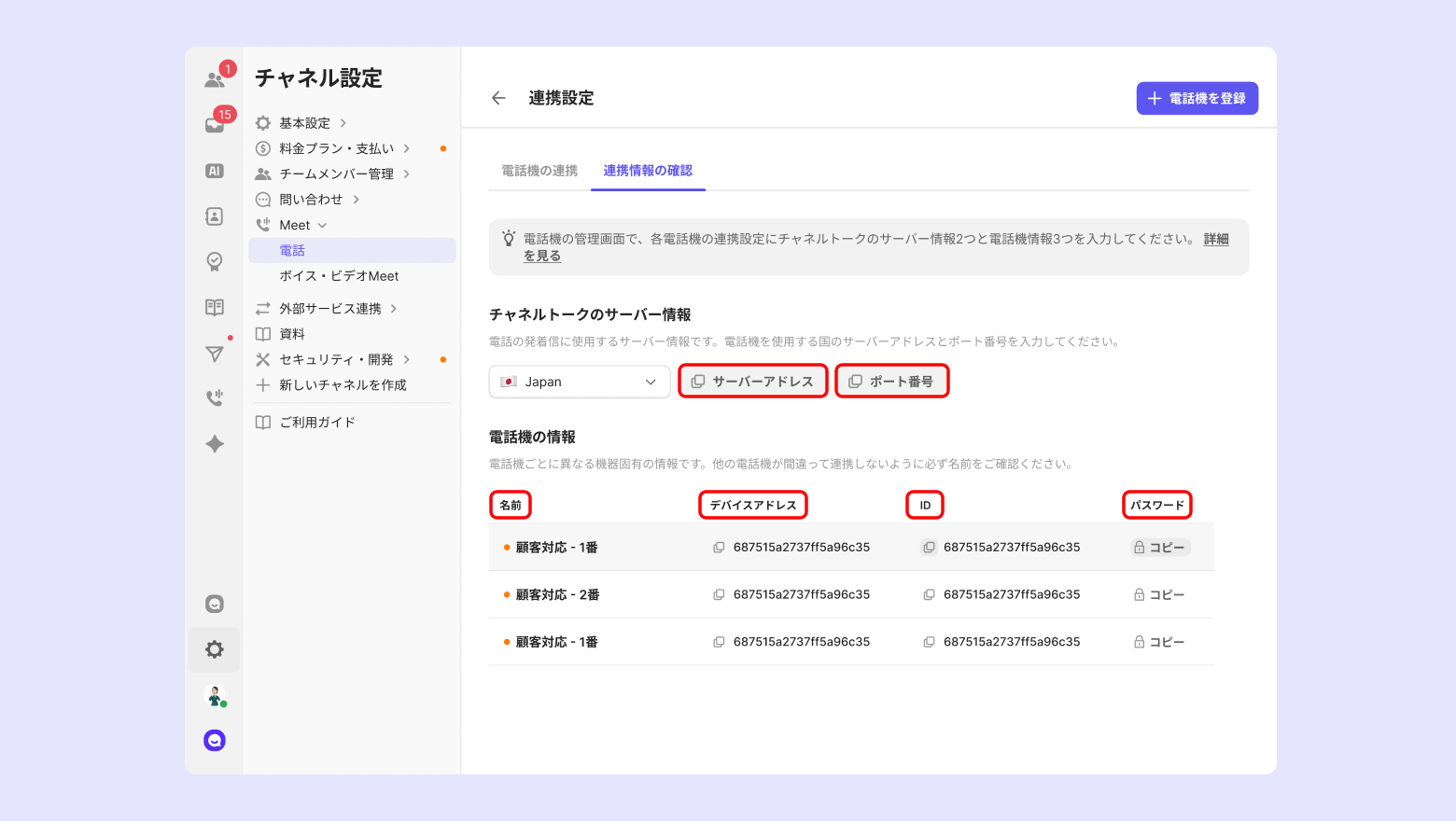[⚙️チャネル設定] - [Meet] - [電話] - [電話機] - [+電話機を登録]