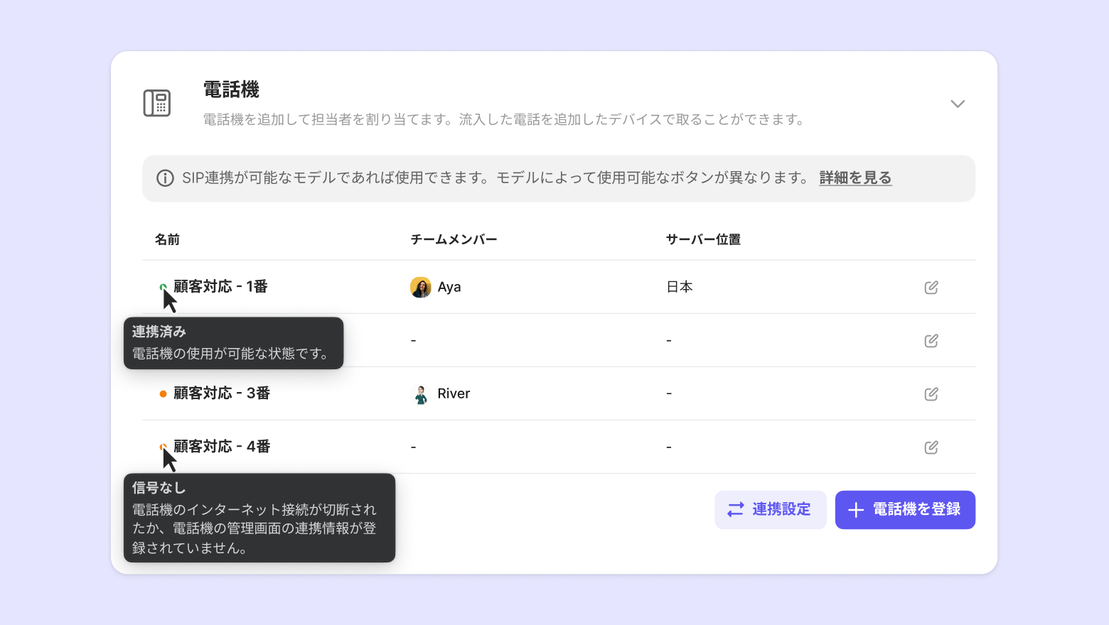 電話機の登録後、右側の修正アイコンをクリックして電話機の名前とチームメンバーを修正できます。