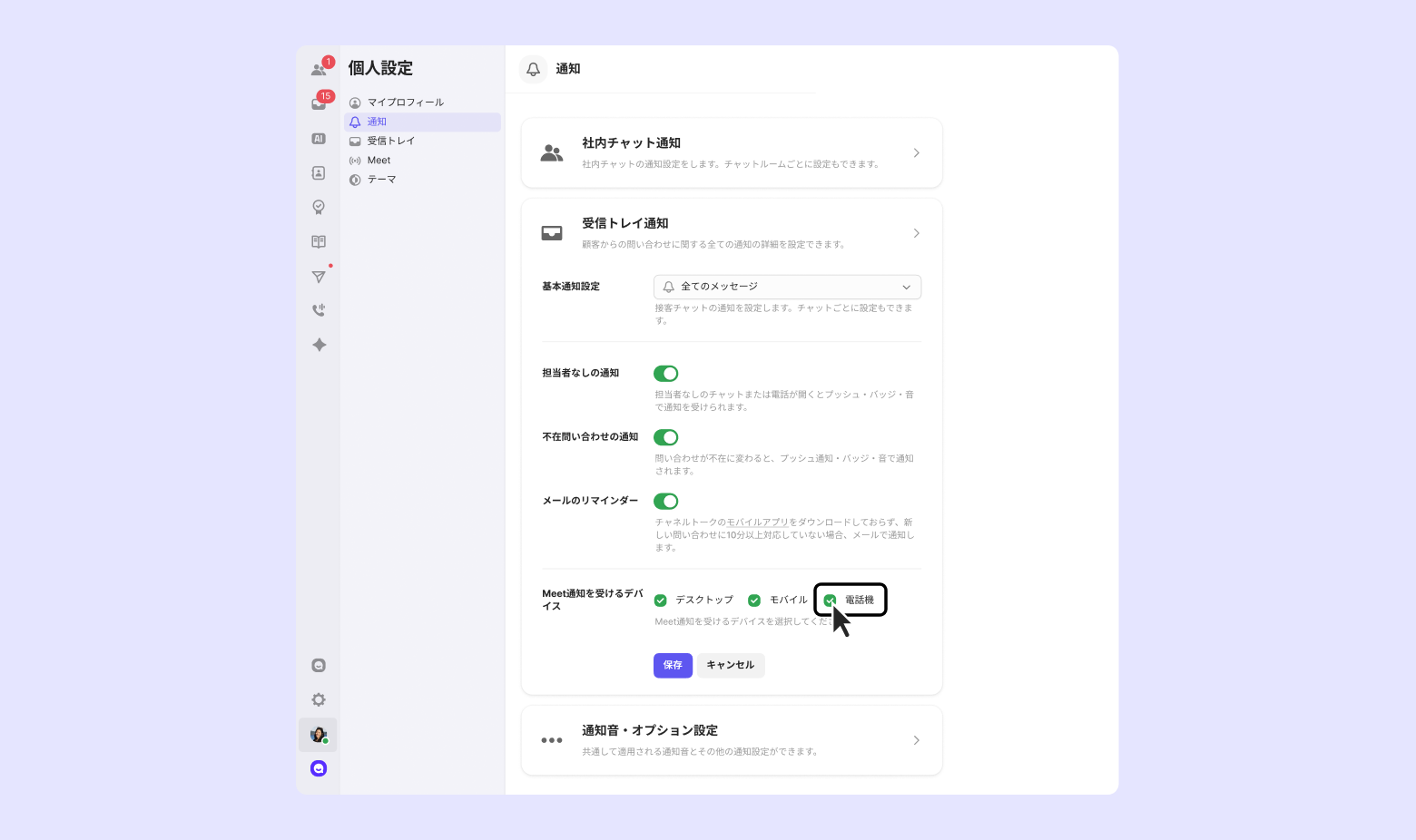 電話機の連携後でも電話が鳴るデバイス(PC/モバイル/電話機)を選択できます。