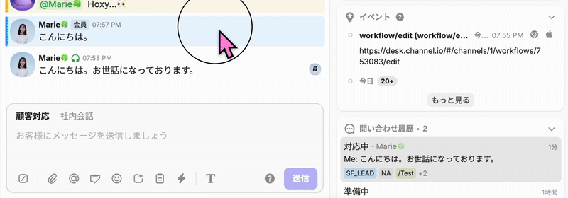 メッセージ上のアイコンをクリックすると、そのメッセージが画面右側の社内ALFサイドビューの入力欄に自動的にコピーされます。複数のメッセージでクリックすると、入力欄の下側に順番に貼り付けられます。