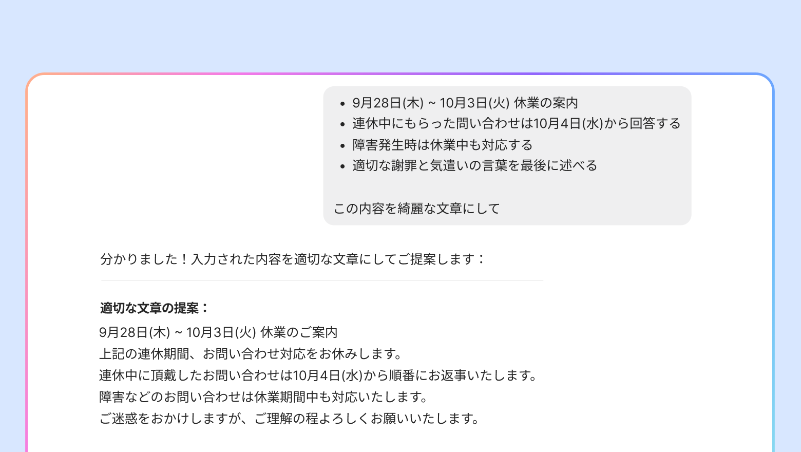 顧客への告知文、メールの本文作成など、自然な文章にしたいときに社内ALFに依頼してみましょう。メモ書きの内容を綺麗な文章にまとめてくれます。