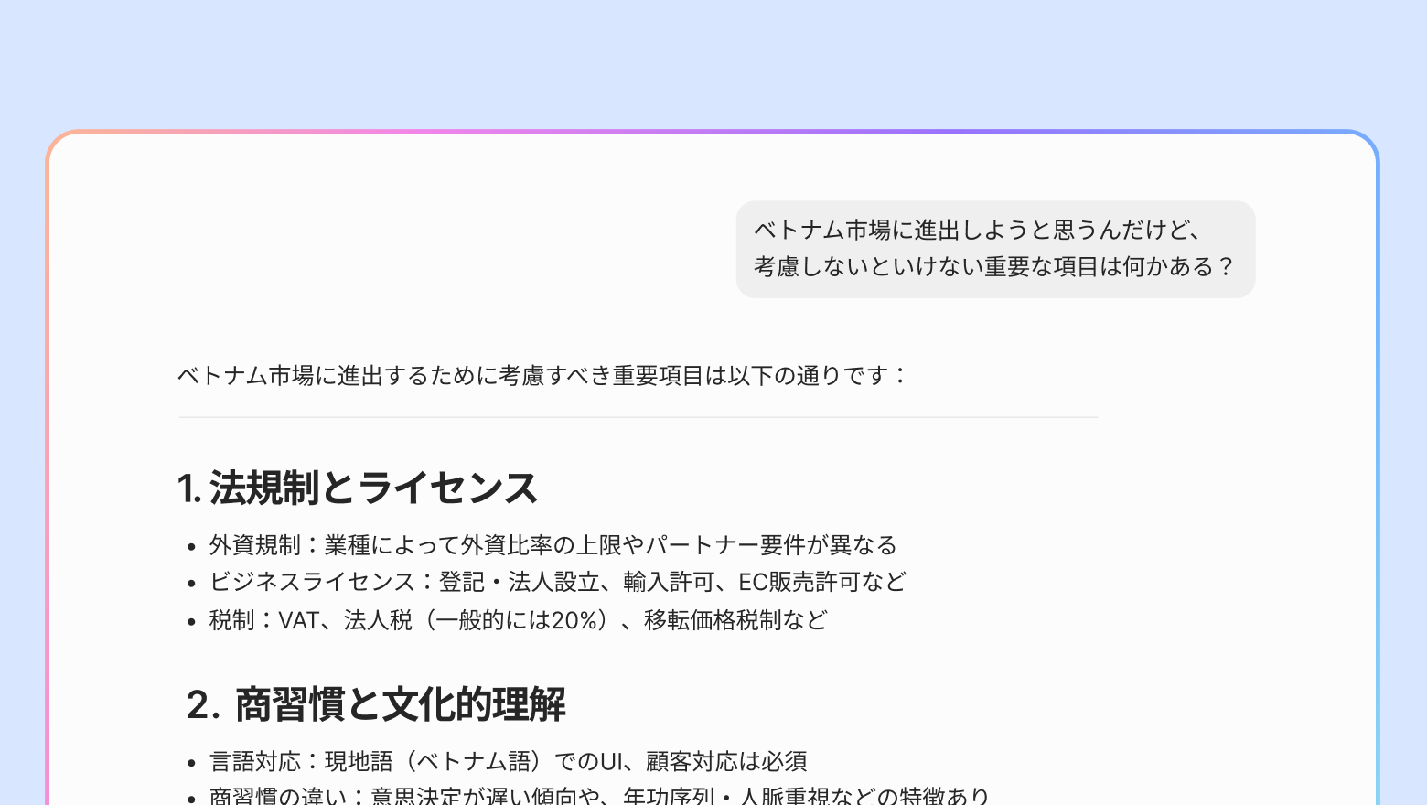推奨質問リスト:どのような質問をすればいいのかが分からないとき、ボタンをクリックしてすぐに質問することができます。