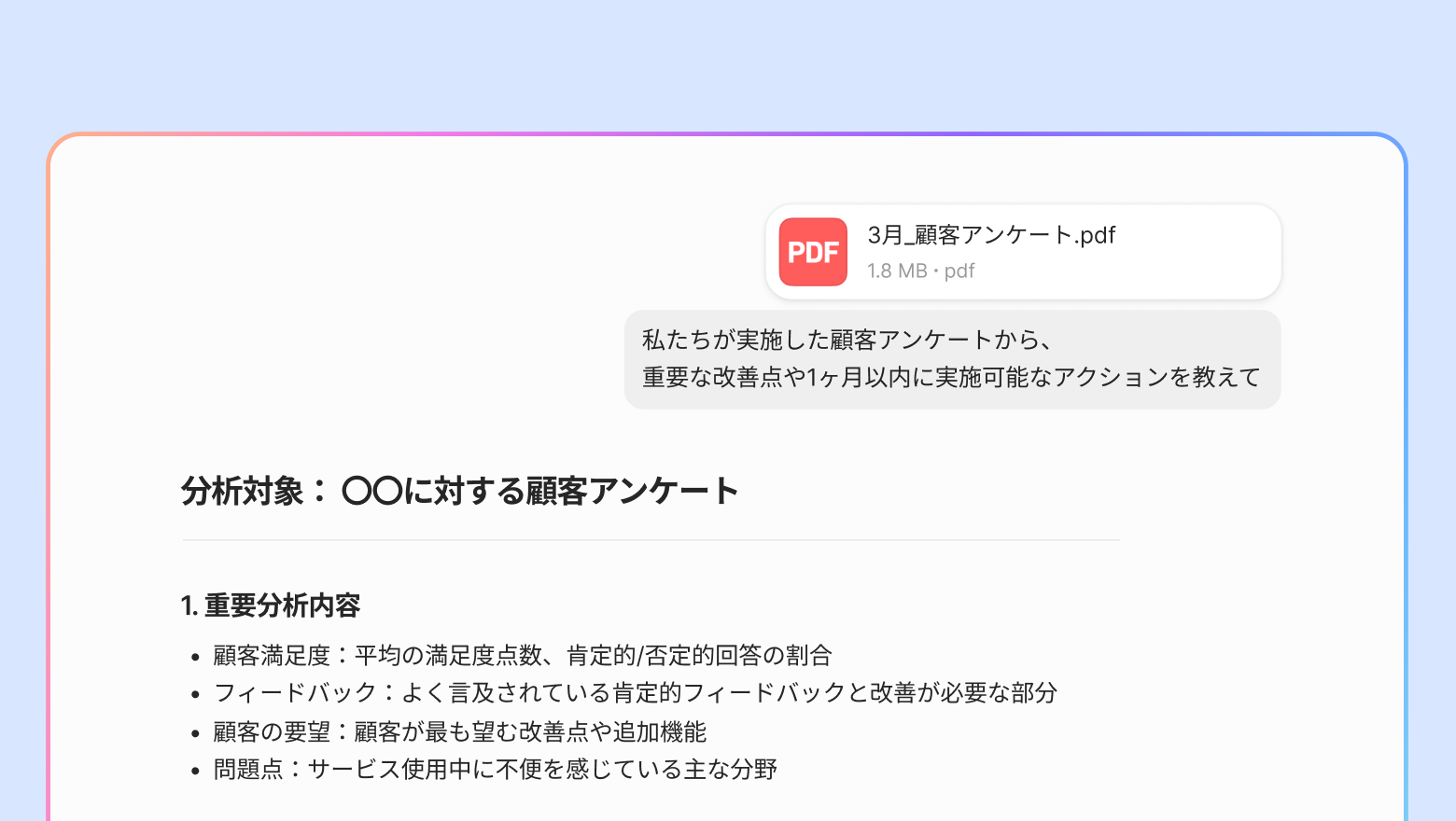 ファイル添付:画像またはPDFファイルを添付するとファイルを読み込みます。ファイル内容を基盤に要約や分析などの多様な作業ができます。