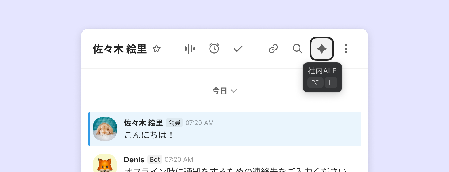チャネルトークの管理画面の右上にある [社内ALF] アイコンをクリックすると、社内ALFに質問でき、回答を受けることができます。