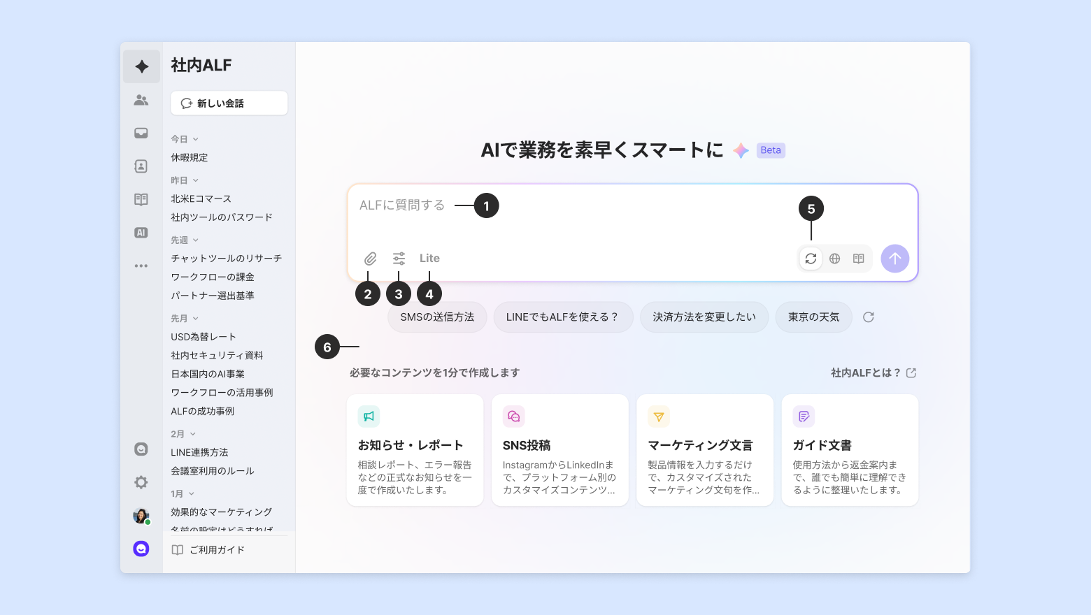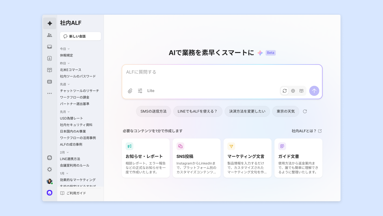 文章の清書やメールの作成、Webリサーチのような小さな質問から、社内規定や製品情報、内部資料の分析のような社内ナレッジ基盤の質問まで、社内ALFを業務全般で活用できます。